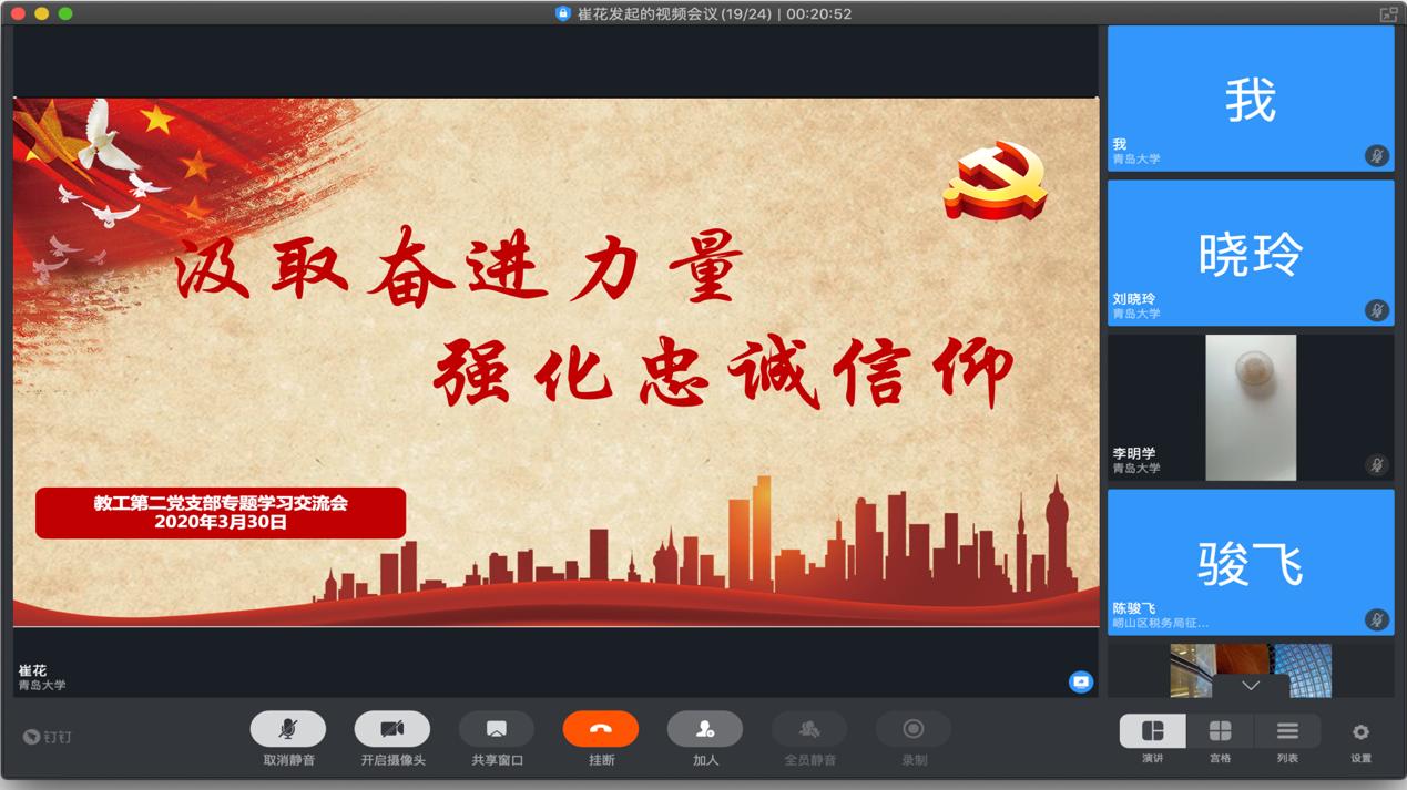 3月20日下午,澳门十大电子正规游戏网站教工第二党支部利用钉钉视频会议召开了“汲取奋进力量,强化忠诚信仰”专题视频学习交流会。会议由教工第二党支部书记崔花主持,澳门十大电子正规游戏网站党委书记王传永及二支部教师党员参加会议。与会党员认真开展了政治理论学习,并结合疫情期间网上授课的经验和体会,对“开展网络思政、强化爱国主义教育、强化对党、对国家的忠诚信仰”等方面内容进行了交流讨论。