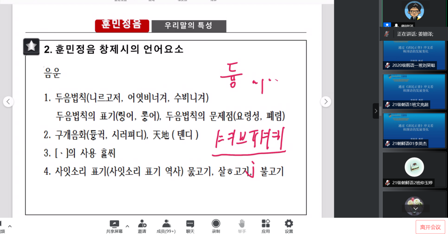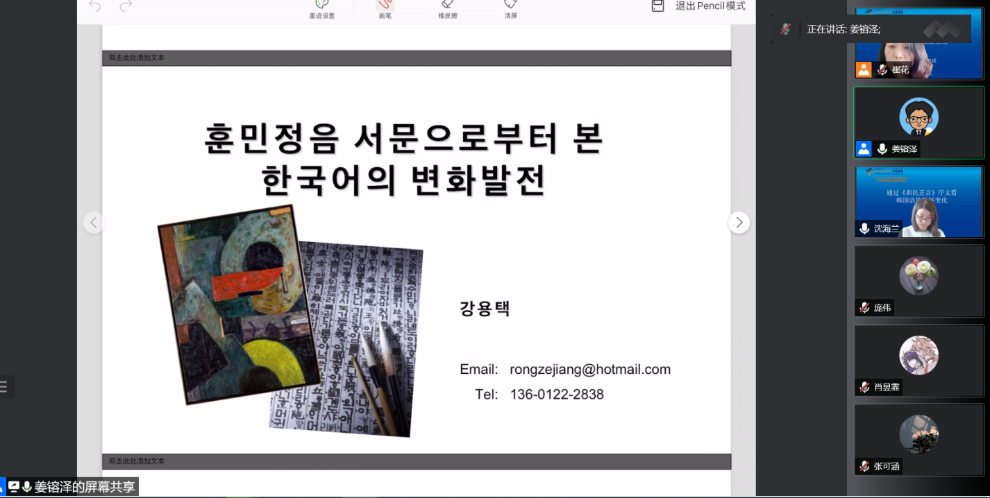 7月4日下午,中央民族大学中国少数民族语言文学学院姜镕泽教授应邀为澳门十大电子正规游戏网站朝鲜语系师生带来了题为“通过《训民正音》序文看韩国语的发展变化”的精彩学术讲座。此次讲座由朝鲜语系主任崔花老师主持,朝鲜语系多位老师以及全院学生通过腾讯会议参与了本次讲座。