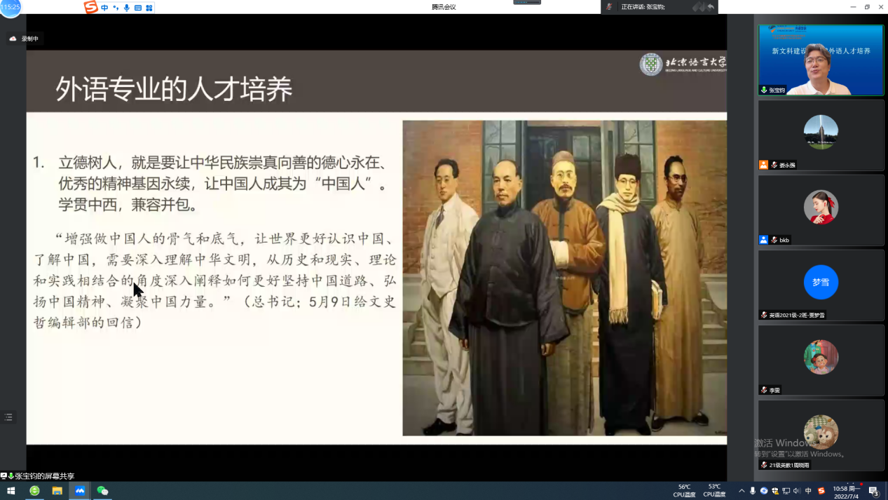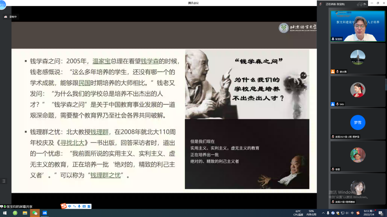 7月4日上午9:00-11:00,北京语言大学副校长张宝钧教授应邀通过腾讯会议为澳门十大电子正规游戏网站师生做了题为“大学人才培养能力建设”的精彩讲座。此次讲座是本年度我校夏季学期高端学术报告和教师发展中心名师讲坛,也是澳门十大电子正规游戏网站20周年院庆系列报告之一。此次讲座由澳门十大电子正规游戏网站院长卞建华教授主持,三百多名师生参加。