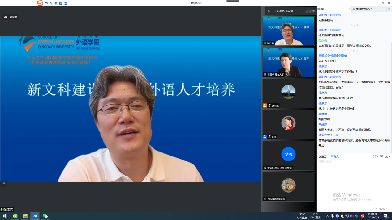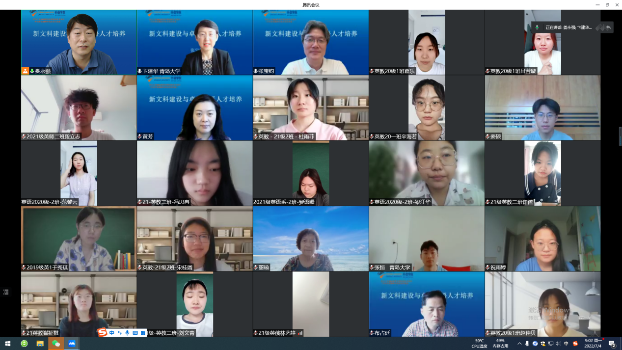 张教授的报告视野高远开阔,内容中西结合,材料旁征博引,语言风趣幽默,让线上师生对外语人才培养有了更深刻理解和思考。报告结束后,张教授又细致解答了老师们线上提出的大学英语教学、工具性课程和通识性课程设置、大类培养、外语专业教材选择等问题。