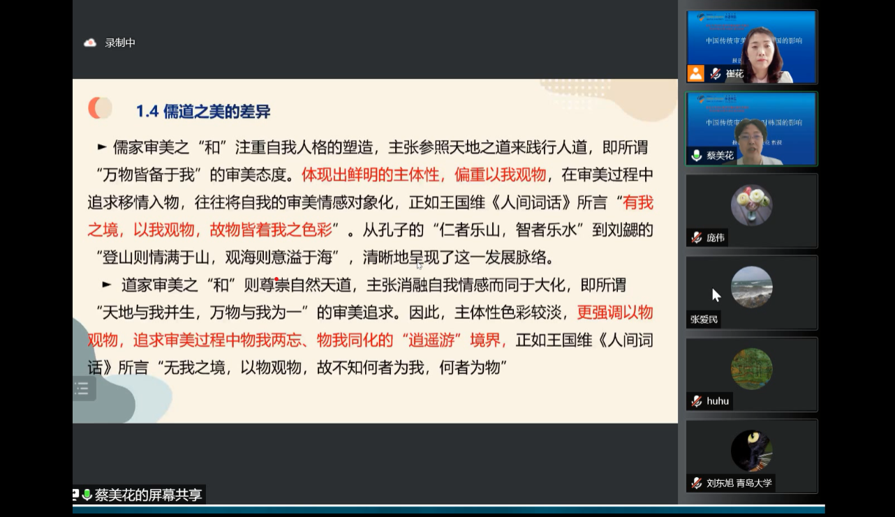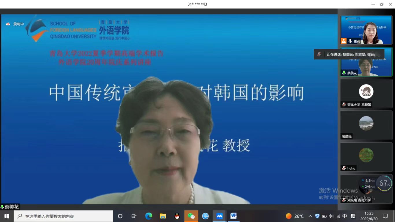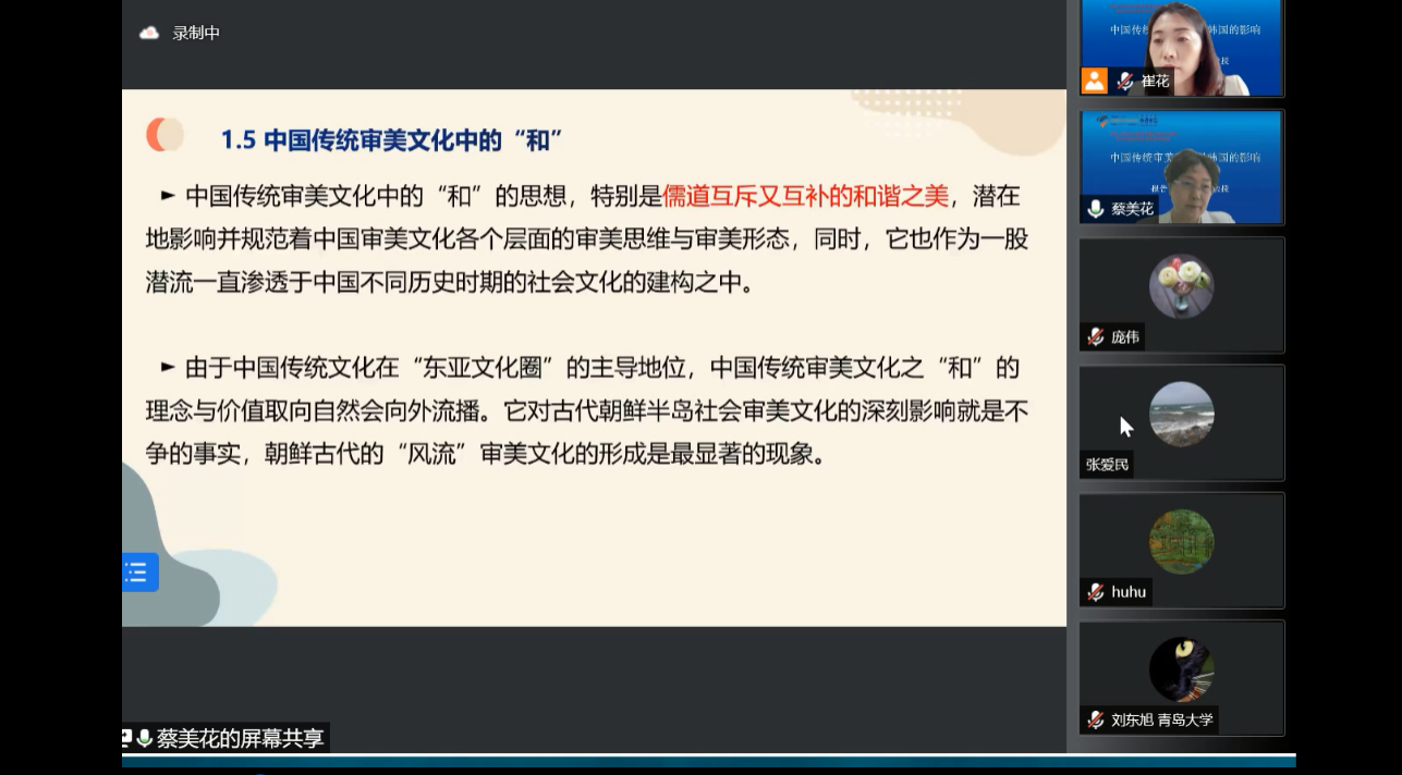 6月30日下午,湖南师范大学蔡美花教授应邀为澳门十大电子正规游戏网站朝鲜语系师生带来了题为“中国传统审美文化对韩国的影响”的精彩学术讲座。此次讲座由朝鲜语系主任崔花老师主持,朝鲜语系多位老师以及学生通过腾讯会议参与了本次讲座。