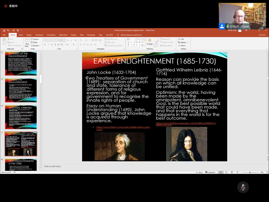 2021年11月1日下午,澳门十大电子正规游戏网站副教授Elliot Shaw为澳门十大电子正规游戏网站师生带来了题为“欧洲启蒙运动与中国”的线上讲座。讲座由英语系王薇老师主持,一百多名澳门十大电子正规游戏网站师生参与了此次讲座。