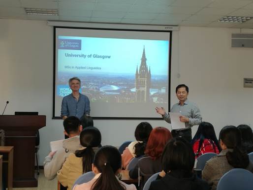 之后Tom为外院师生介绍了格拉斯哥大学的应用语言学硕士项目。首先Tom用生动的语言和贴近生活的例子为大家讲解了什么是应用语言学。接着Tom教授为大家详细介绍了该项目的课程结构以及课程内容,并且为大家介绍了应用语言学特有的奖学金项目。此外,Tom教授还重点介绍了格拉斯哥大学的短期暑期课程。