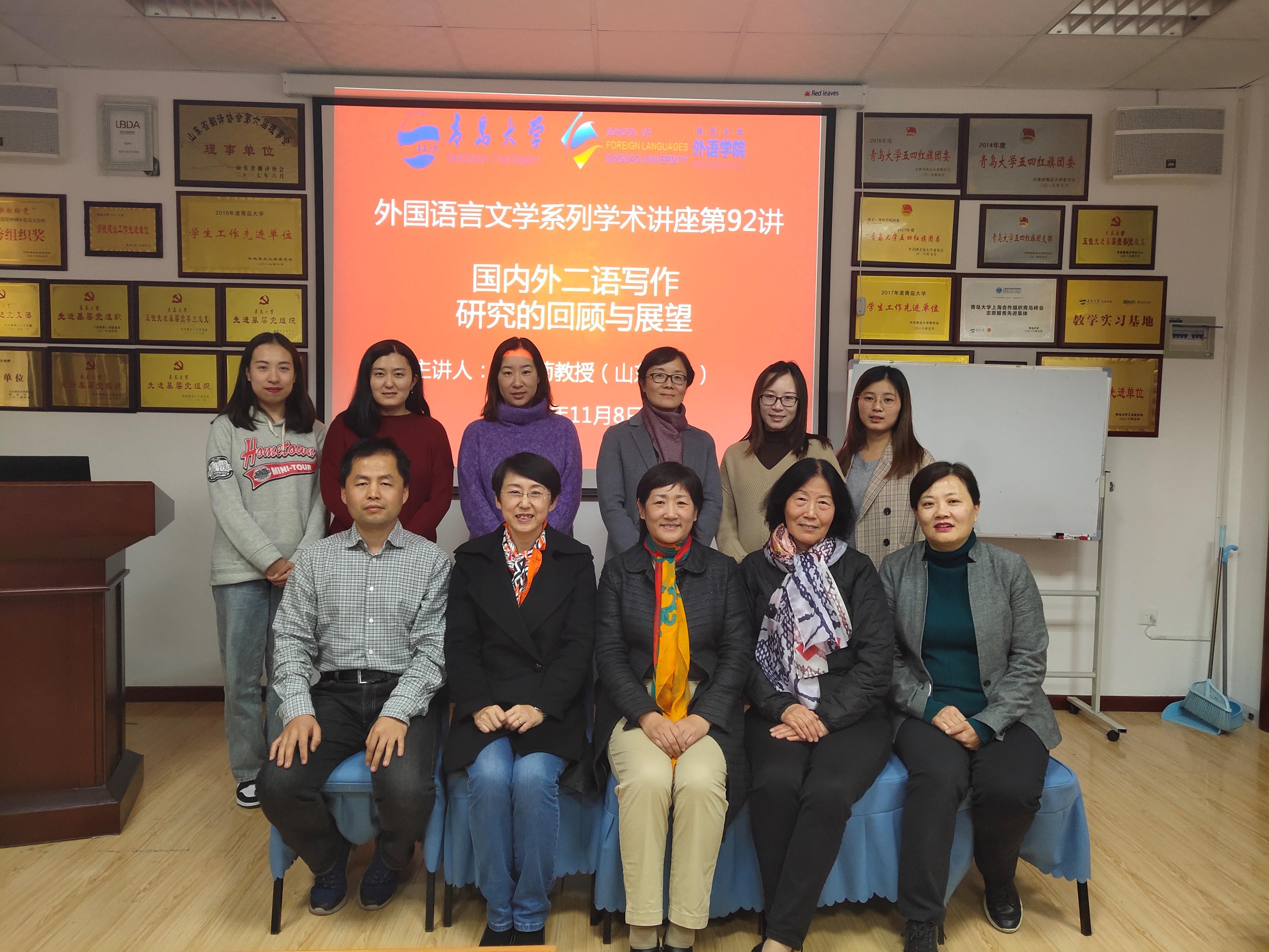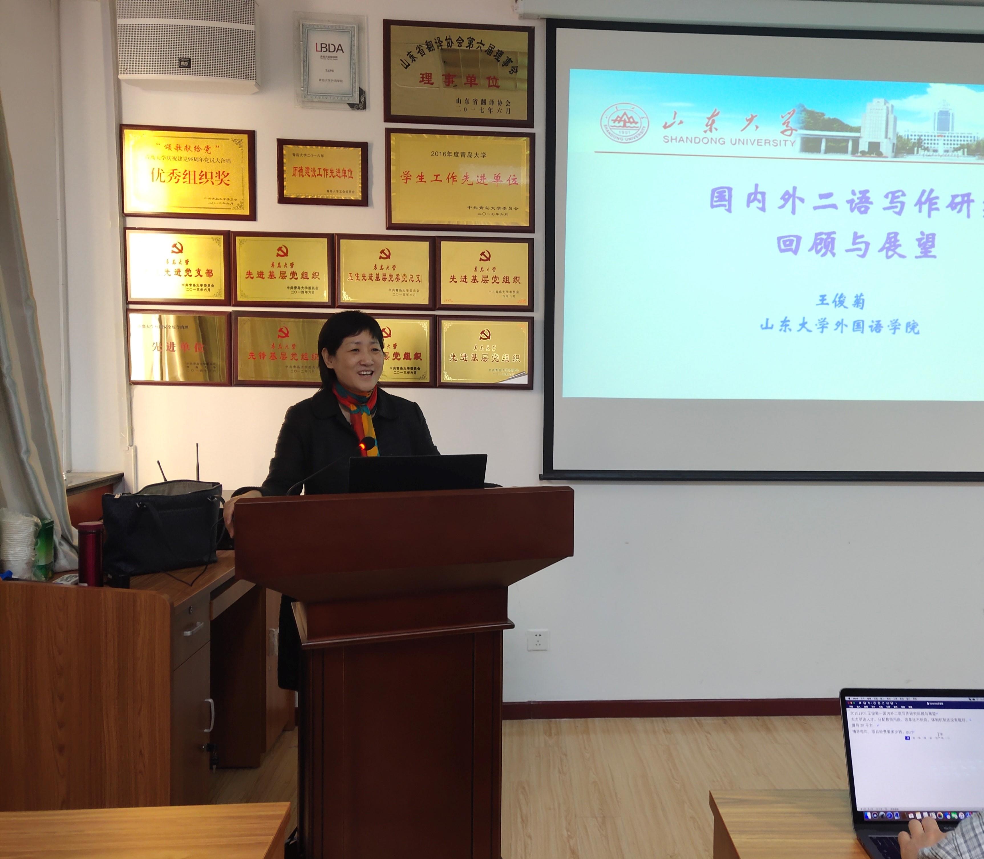 2019年11月8日,山东大学特聘教授王俊菊在博文楼312室为澳门十大电子正规游戏网站师生带来了题为“国内外二语写作研究的回顾与展望”的精彩学术讲座。此次讲座由澳门十大电子正规游戏网站院长卞建华主持,澳门十大电子正规游戏网站副院长布占廷以及孙旻、王曼等老师和澳门十大电子正规游戏网站部分学生出席了讲座。