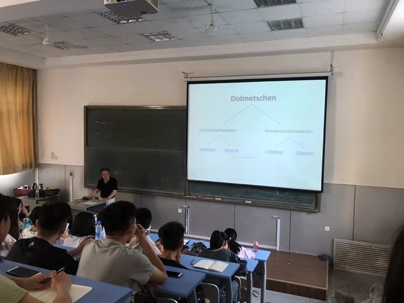 7月9日上午,华东师范大学澳门十大电子正规游戏网站德语系主任宋健飞教授受邀在博文楼219教室作题为“德语口译:从概念到实践”的报告。德语系主任綦甲福和刘沁卉老师主持报告会,十大电子正规游戏官网德语系部分老师、全体学生、巴伐利亚州山东代表处代表以及来自中国海洋大学、青岛科技大学和信息工程大学(洛阳校区)的师生共150余人参加。