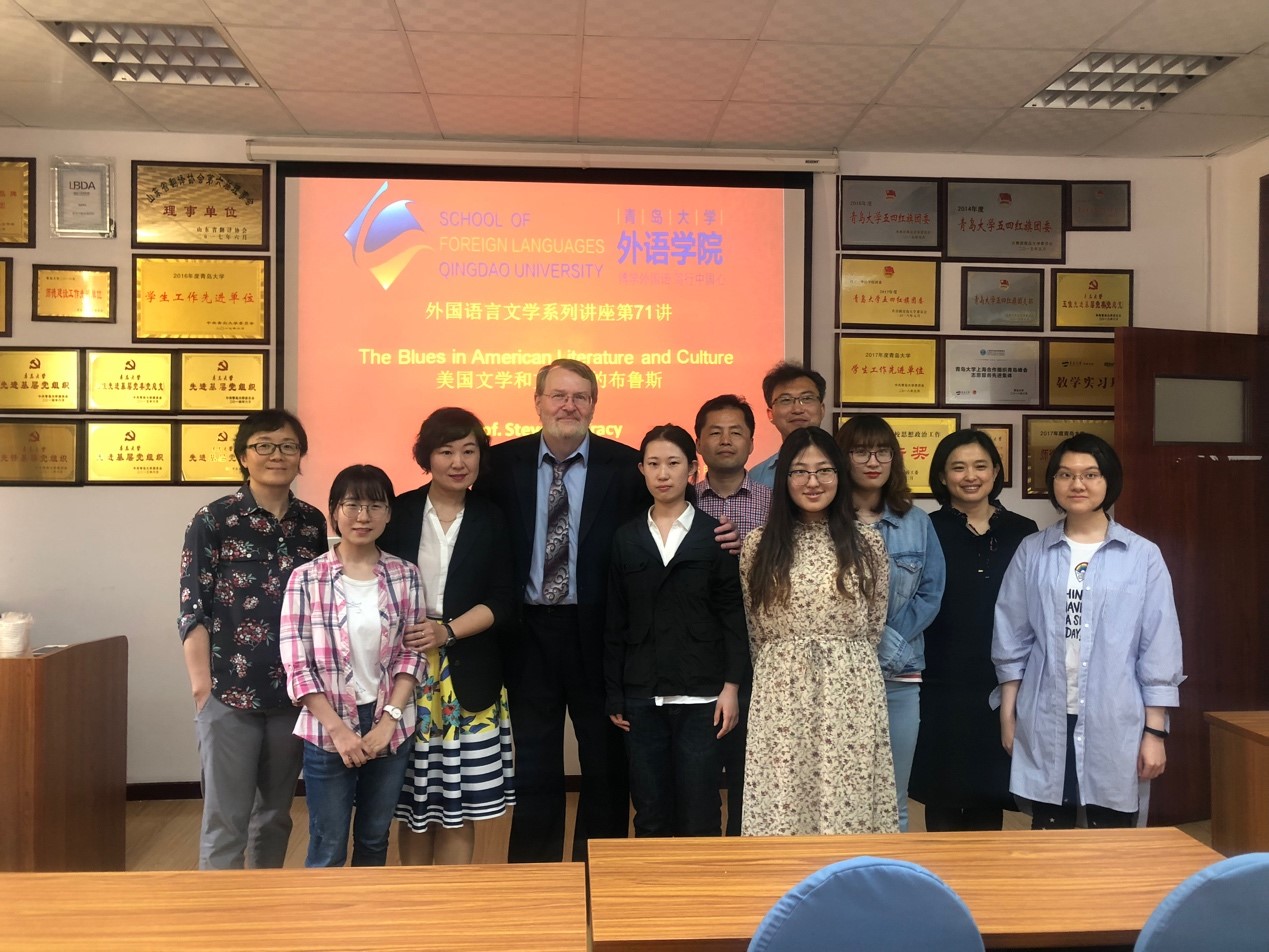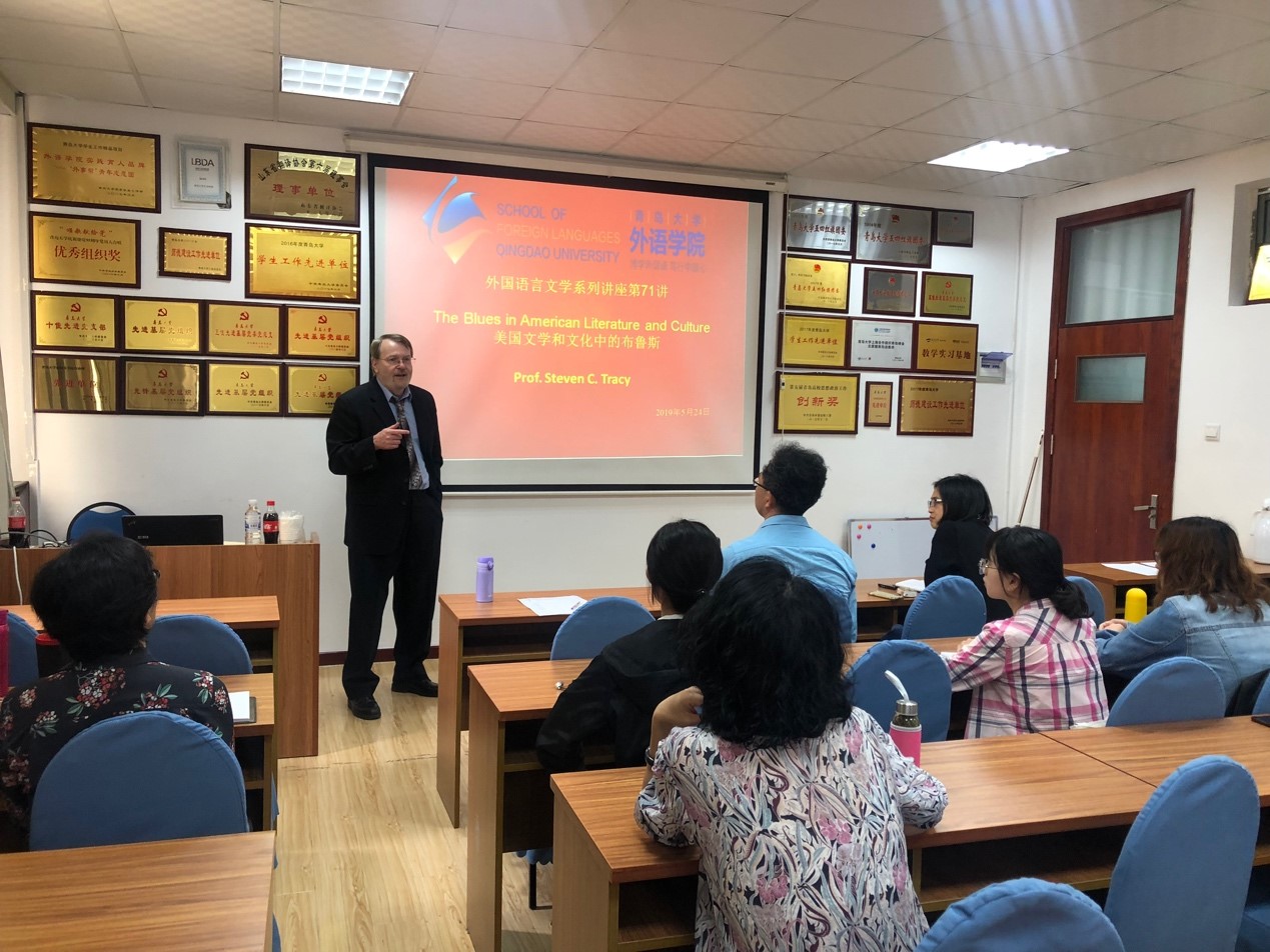 2019年5月24日上午,马萨诸塞大学阿默斯特分校杰出教授、非裔美国文学研究学者、音乐表演家史蒂文•特雷西(Steven C. Tracy)应邀到澳门十大电子正规游戏网站,带来了一场题为“美国文学和文化中的布鲁斯”的讲座。讲座由英语系王薇老师主持,澳门十大电子正规游戏网站、公共外语教育学院多名师生聆听了特雷西教授别开生面的讲座。