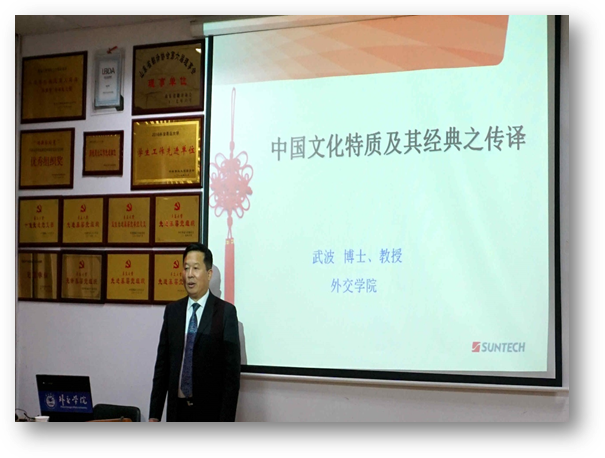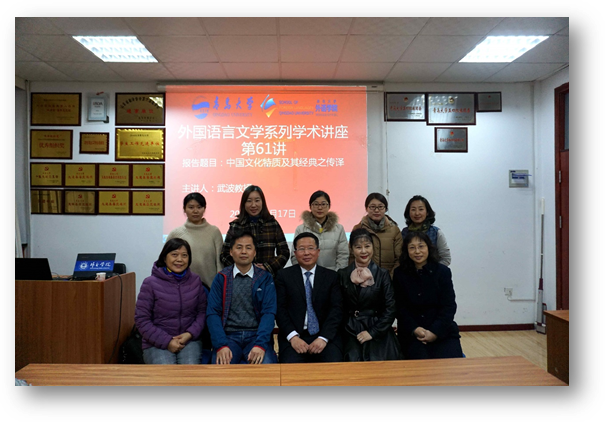 12月17日下午,澳门十大电子正规游戏网站举行外国语言文学系列学术讲座第61讲。外交学院英语系教授武波,应邀为外院师生做了“中国文化特质及其经典之传译”的专题学术讲座。院长助理布占廷主持讲座,学院部分老师及研究生参加此次讲座。