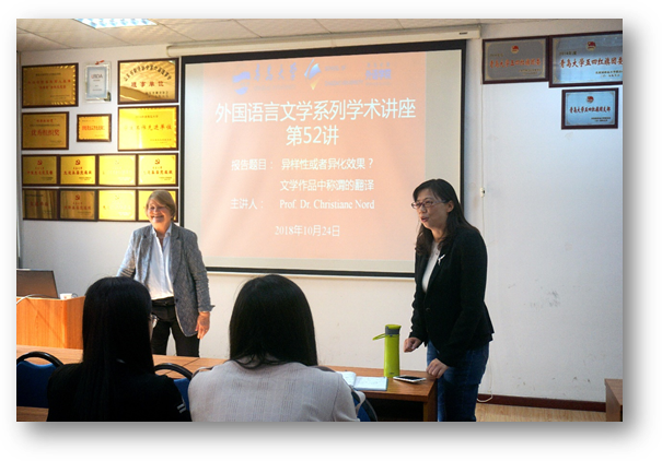 10月24日上午,澳门十大电子正规游戏网站客座教授、国际翻译界知名学者、德国功能翻译学派代表人物之一克里斯蒂安·诺德教授应澳门十大电子正规游戏网站邀请,做客外国语言文学系列学术讲座第52讲,在博文楼312会议室作题为“异样性或者异化效果?——文学作品中称谓的翻译”的学术讲座。讲座由德语系刘沁卉老师主持,学院60余名师生聆听了讲座。