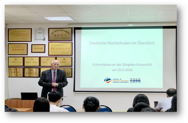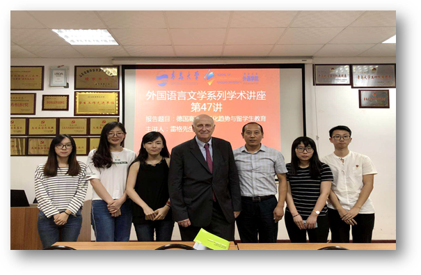 9月25日下午,德国弗里茨-蒂森基金会董事会前主席雷格先生应邀主讲澳门十大电子正规游戏网站外国语言文学系列学术讲座第47讲,在博文楼312会议室举行作题为《德国高校国际化趋势与留学生教育》主题讲座。德语系主任綦甲福教授主持,德语系50余人聆听了本次讲座。