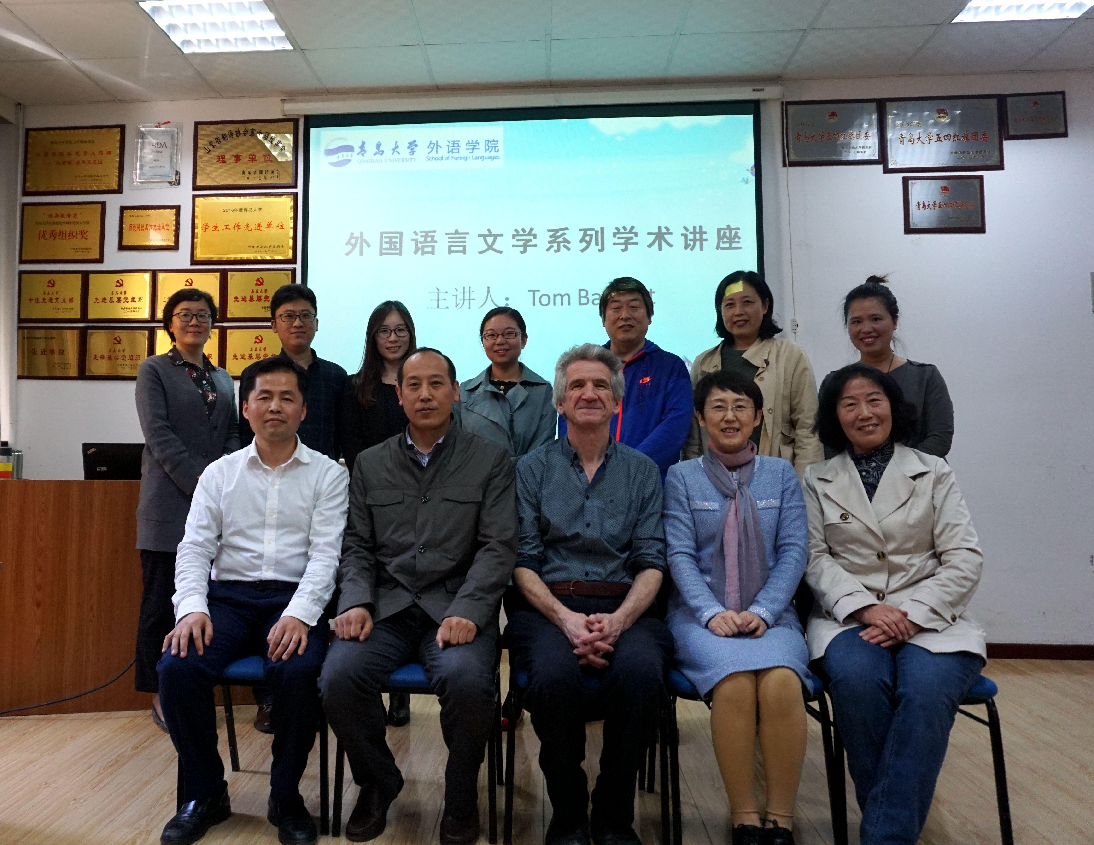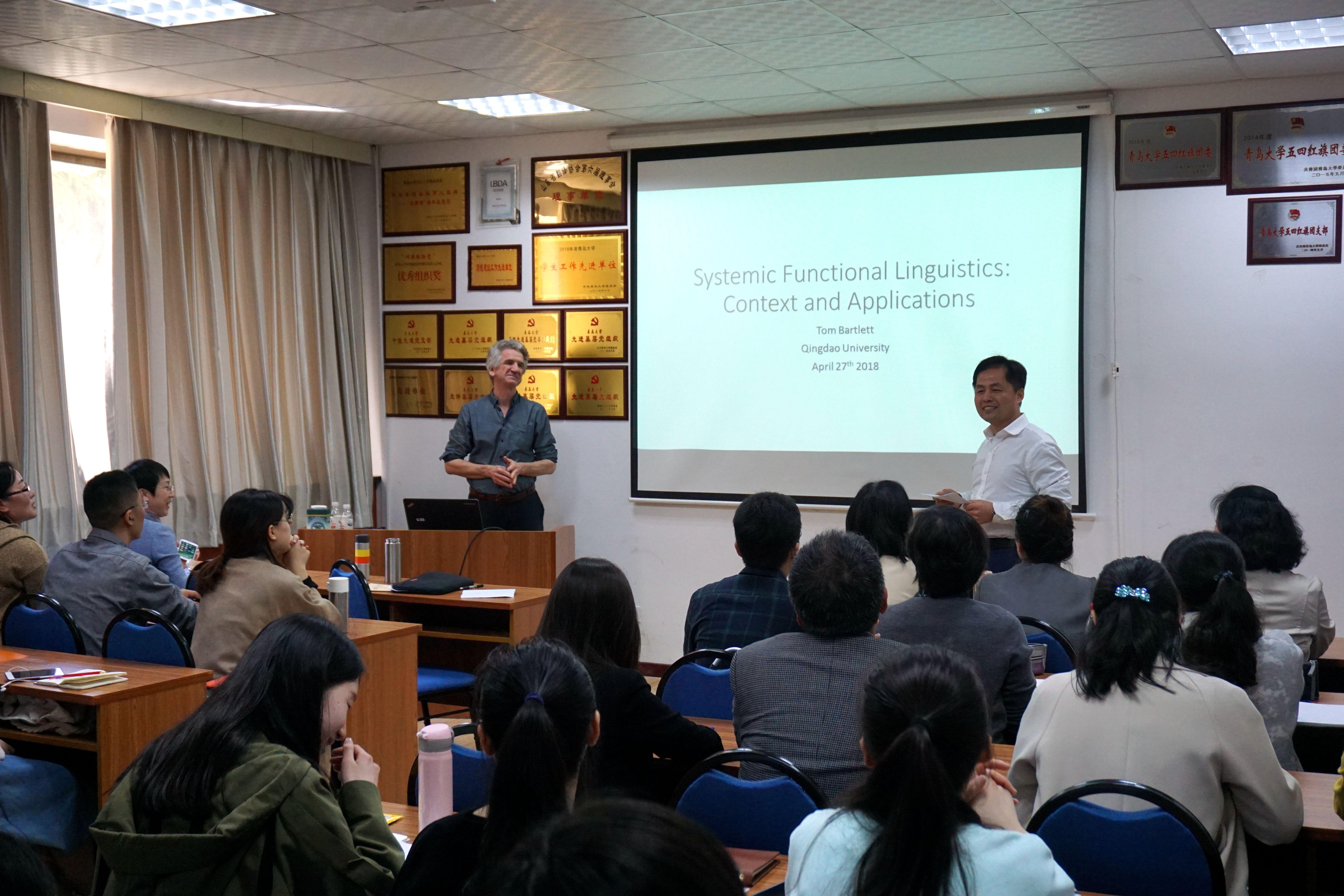 4月27日上午,澳门十大电子正规游戏网站在博文楼312会议室举行外国语言文学系列学术讲座第38讲。英国卡迪夫大学Tom Bartlett博士应邀作“系统功能语言学:语境与应用”专题学术讲座。院长助理布占廷主持。院长卞建华、学院部分教师和研究生,以及来自中国海洋大学、青岛科技大学和我校公共外语教育学院的十余位教师聆听了讲座。