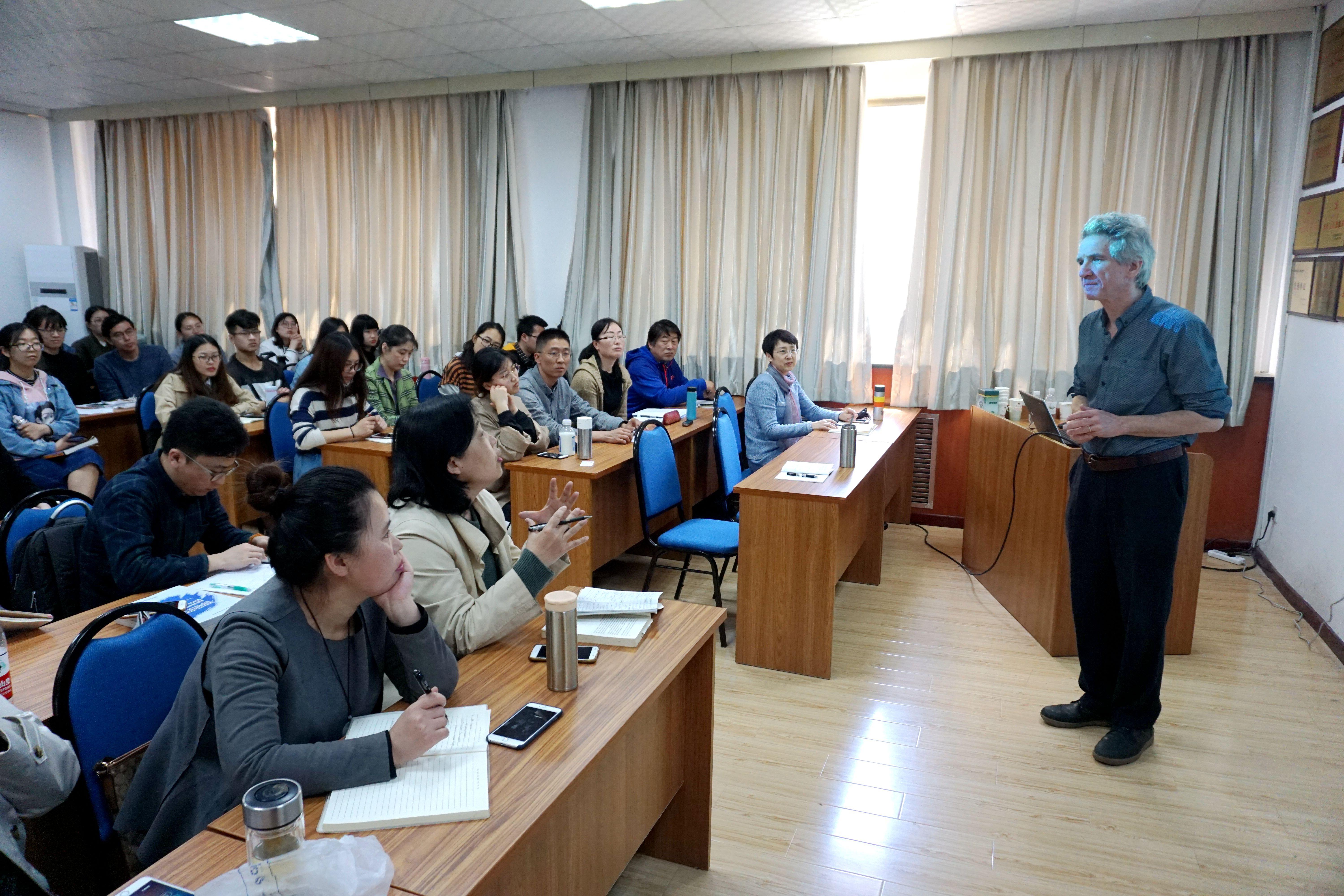 Bartlett博士的讲座结构清晰、深入浅出、例证丰富,受到了师生的一致好评。讲座结束时,他回答了师生们的相关疑问,例如:情境语境因素与三大元功能的关系、功能语言学视域下的翻译研究路径、主位划分、情境语境和文化语境的关系。(王乐、布占廷)
