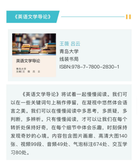 2024年10月,数字教材《英语文学导论》正式出版上架。本数字教材基于英语专业必修课程《英语文学导论》的教学要求编写,融知识与实践于一体,在教学内容、教学方式、考核方式和教学手段等方面进行了积极有效的数字化创新与改革,具有鲜明的数字化、专业性、前沿性的特色与优势。本数字教材主编、澳门十大电子正规游戏网站副院长王薇教授及其教材编写团队,结合多轮线下课堂教学经验和学堂在线上线的同名慕课的开课情况,对数字教材的教学材料进行遴选,经过精心的编写和后期制作,完成了由图片画廊、高清大图140张、视频99段、音频49处、气泡标注674处、交互学习80处组成的数字教材。