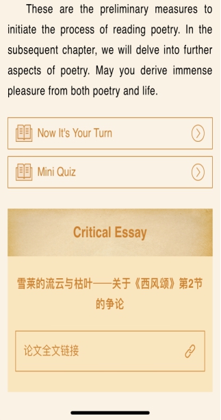 该数字教材以小说、诗歌、戏剧三大文类为基本框架,有机融入当代英语文学发展趋势新内容。通过分章设计,将创意写作、数字诗歌、戏剧展演等创新内容渗透各个章节之中,学生可以充分领略英语文学的精华与当下发展的新趋势。该教材注重引导学生参与教学过程,根据学习目标设计教学活动,在每个单元插入图片、音频、视频等多模态数字化内容,设置思考题、讨论环节、诗歌朗诵、学术文献阅读等教学实践环节,使学生充分体验文学的思想内涵和人文精神,体现价值引领。《英语文学导论》数字教材遵循新文科背景下外语专业教学要求,使具备英语阅读能力的学习者既能对英语文学经典作品进行较为专业的阐释,又能提升文学阐释能力、情感表达能力、思辨能力,助力英语学习者具备使用英语讲好中国故事、向世界传播中国声音的文学素养。