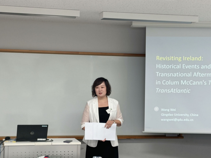 十大电子正规游戏官网研究中心教师王薇教授在小组发言。王薇教授的发言以当代爱尔兰裔美国作家科伦·麦凯恩的小说《飞越大西洋》为研究对象,结合跨国主义、新历史主义等理论视角,探讨当代爱尔兰移民小说中的新历史叙事、情感叙事、移民叙事与爱尔兰性之间的联结。王教授发言后与同组学者观众进行了较为热烈的互动讨论。会议期间,王薇教授还与国内外学者进行了广泛交流,宣传了我校外国文学研究中心,增进了中外学术了解。