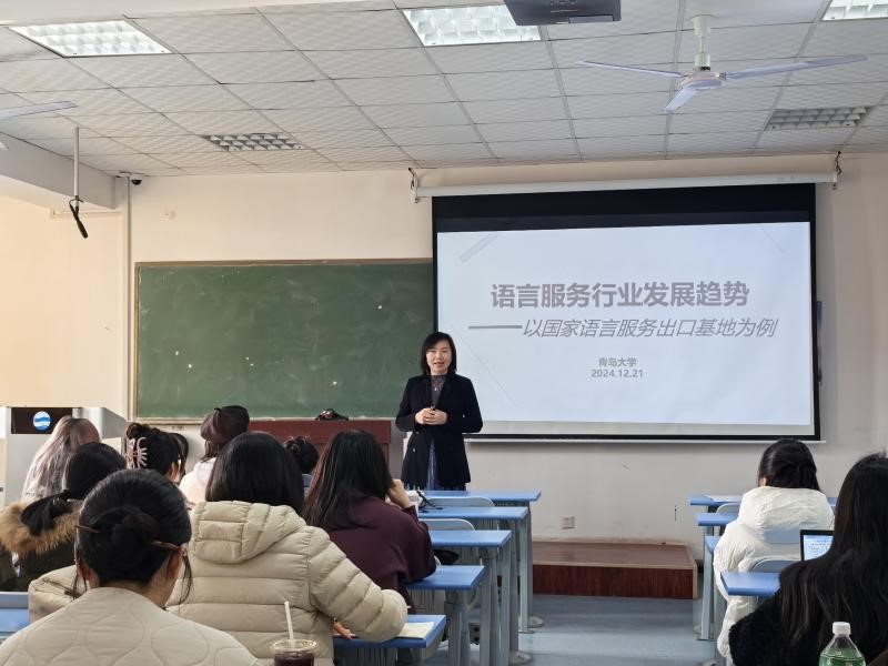 12月21日下午,中冶东方工程技术有限公司翻译中心主任、译审、一级翻译、中国翻译协会理事赵忠会老师作为主讲嘉宾,以国家语言服务出口基地为例,深入剖析了语言服务行业的发展趋势。 她分别以越南文化、影视配音、翻译机测评为案例,生动形象地阐述了语言服务行业的八大发展趋势,并提醒同学们要关注人工与AI的发展,时刻保持危机意识,不断提升自己的专业能力和价值。赵老师指出,未来语言服务行业具备可塑性强、综合素质高、认同企业文化等特质的人才将更受行业青睐。她鼓励同学们在未来工作岗位中,既要入则为相,也要出则为将。