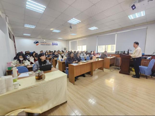 12月4日下午,澳门十大电子正规游戏网站在浮山校区博文楼312会议室举办硕士研究生导师培训暨外国语言文学系列学术讲座第202讲——“译学为导、译术为要,精准翻译,讲好中国故事研究”。本次讲座由吉林外国语大学高级翻译学院谢旭升教授主讲,学院副院长曹杉主持。学院院长卞建华、德语系主任綦甲福等2025级MTI研究生及导师参加了讲座。