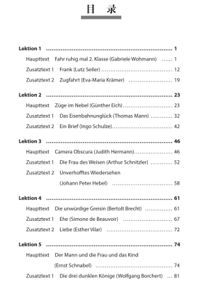 该教材共10个单元,以德语文学短篇文本为主,体裁涵盖短篇小说、寓言、诗歌、随笔等。所选课文为德语文学发展史上各个时期的经典之作,部分作品已成为德语区日耳曼语言文学专业大学生的必读篇目。在课后练习的设计上,教材不要求学生已具有较多文学理论知识,而是引导学生进行“书读百遍,其义自见”式的文本细读,从而培养学生的德语语言能力和文学赏析能力。