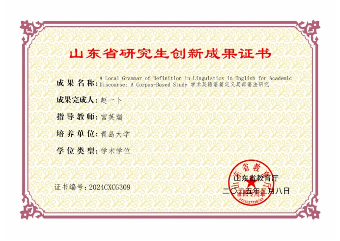 此外,十大电子正规游戏官网外国语言学及应用语言学宫英瑞教授指导的2022级硕士研究生赵一卜,其研究成果A Local Grammar of Definition in Linguistics in English for Academic Discourse: A Corpus-Based Study荣获山东省研究生创新成果奖。此次系十大电子正规游戏官网首次获得该奖项。宫英瑞教授在选题论证、框架构建和论文撰写中给予全过程指导,帮助学生提升科研创新能力。学院定期组织的学术沙龙与专题工作坊,通过体系化交流机制有利提升了学生的科研水平。