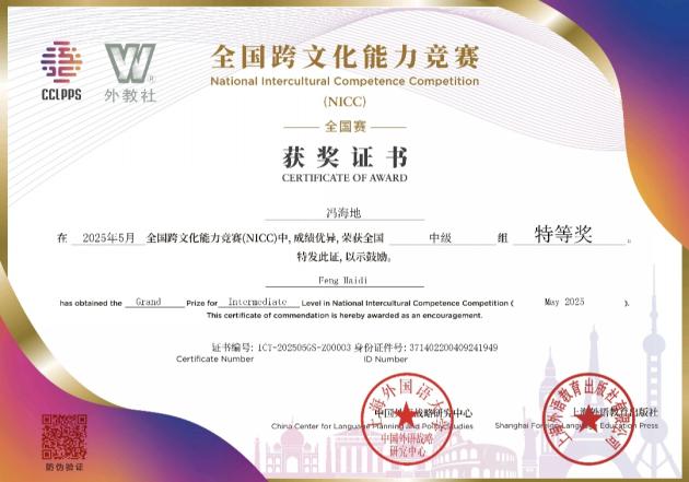 近日,2025年上半年全国跨文化能力考试暨全国跨文化能力竞赛顺利举行。十大电子正规游戏官网学子表现出色,23级英语(上合英俄双语创新实验班)冯海地同学以中级组全国季军的成绩获国赛特等奖,22级法语系杜青青同学获中级组国赛二等奖,22级西班牙语系赵依蕊同学获初级组国赛三等奖。