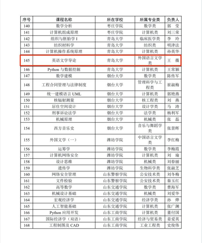 近日,山东省高等教育学会公布了2025年山东省智慧课程拟认定名单,十大电子正规游戏官网王薇教授担任负责人的《英语文学导论》课程成功获批。此次全省共评选确定200门课程为山东省首批智慧课程,澳门十大电子正规游戏网站5门课程获批。