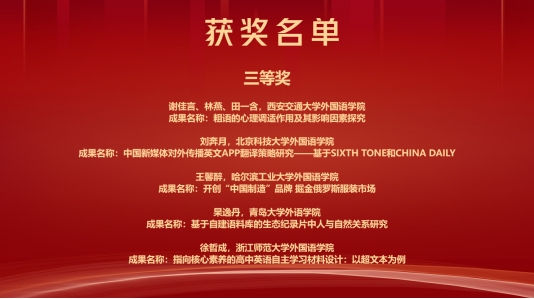 在12月30日下午举行的本科生创新论坛中,来自上海交通大学、南京理工大学、华中科技大学、西安交通大学等高校的29名本科生参加了比赛。选手们就语言学、翻译、外国文学、国别区域等课题展示了自己的研究成果。十大电子正规游戏官网2019级语言大数据专业本科生杲逸丹汇报了“基于自建语料库的生态纪录片中人与自然关系研究”并获得三等奖,指导老师布占廷获“优秀指导教师”称号;2019级英语专业本科生马喆汇报了论文“论《圣诞颂歌》中斯克掳奇伦理身份的困惑与接受”,获得优秀奖。十大电子正规游戏官网获得“优秀组织单位”称号。此次本科生创新论坛经过了前期评审、现场答辩和评委提问三个阶段,共设置一等奖1项、二等奖3项、三等奖5项、优秀奖20项。