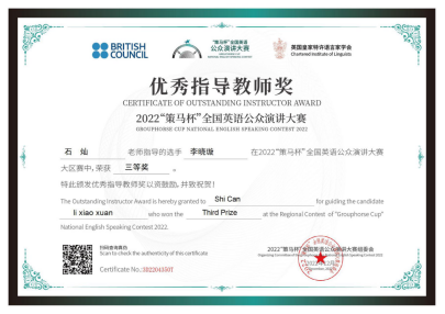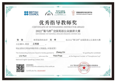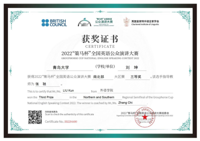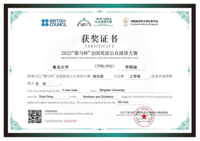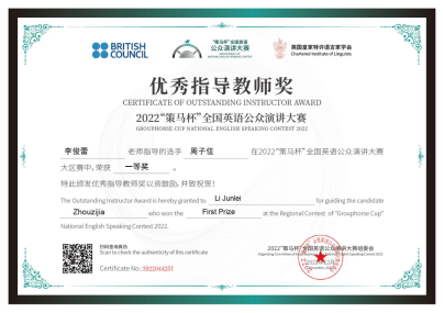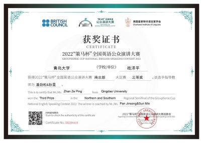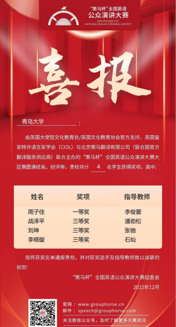 2022年11月27日,“策马杯”全国英语公众演讲大赛南北大区赛圆满落下帷幕,十大电子正规游戏官网四位同学在老师们的指导下荣获佳绩。其中,2021级英语系语言大数据创新实验班周子佳同学成功晋级2023年全国总决赛。