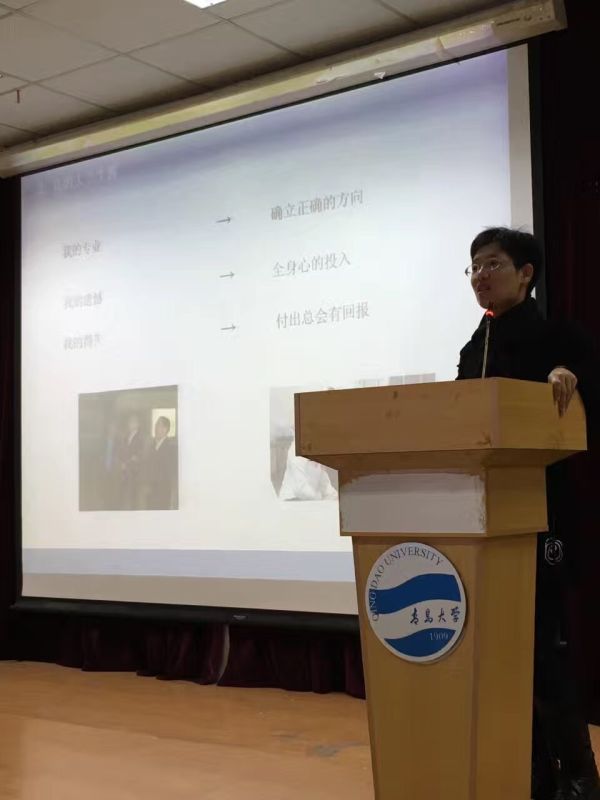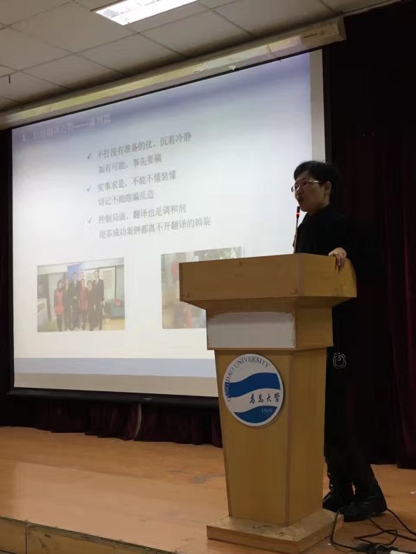 校友刘玉结合自身经验,现身说教,讲到大学期间要确立正确的方向,全身心投入;初涉职场要抓住机遇,脚踏实地;在翻译方面要做到博览群书,开阔眼界,把握中外文化差异;翻译谈判要沉着冷静,实事求是。最后刘玉送给同学们一句话“珍惜现在,充实自己,不给青春留下遗憾。”
