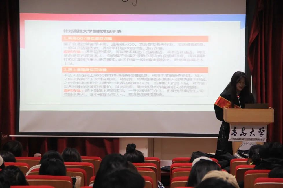 安防团成员针对校园反诈进行了宣讲。近年来电信诈骗对高校大学生造成了重大财产损失,危害社会治安,防诈骗形式也日益严峻。通过QQ/微信借款诈骗、网上兼职刷单等方式诱导大学生落入诈骗陷阱的案例屡见不鲜。大学生们应做到不轻信陌生人,不泄露账户密码,慎重向他人汇款。切实保护个人财产和信息安全,提高防范意识,将防诈骗知识运用到现实生活中。