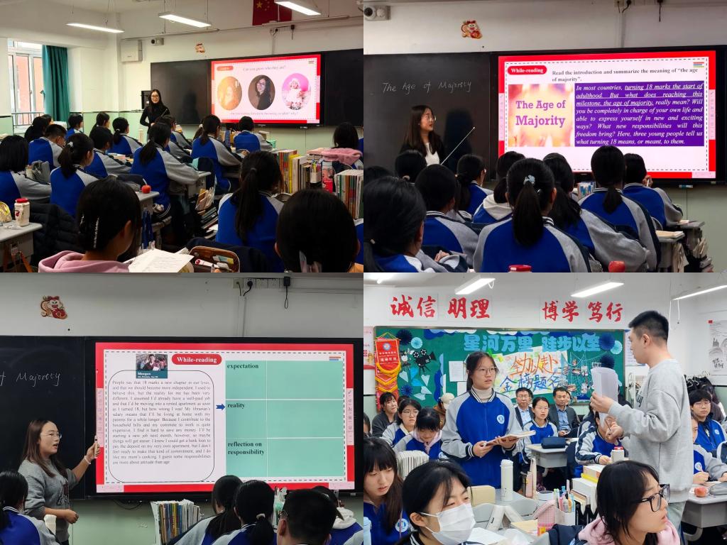 授牌仪式正式启动前,十大电子正规游戏官网赵虹、陈亦菲、罗甫梅、马优四位研究生同学在高二•四班开展了课堂教学实践展示。同学们以“The Age of Majority”为题,展示了扎实的学科功底与灵活应变的能力。课后的集体教研环节,由梁永召老师主持,四位同学开展了课堂反思与感悟。高晓亮副校长、布占廷副院长、任爽老师进行了指导与点评。