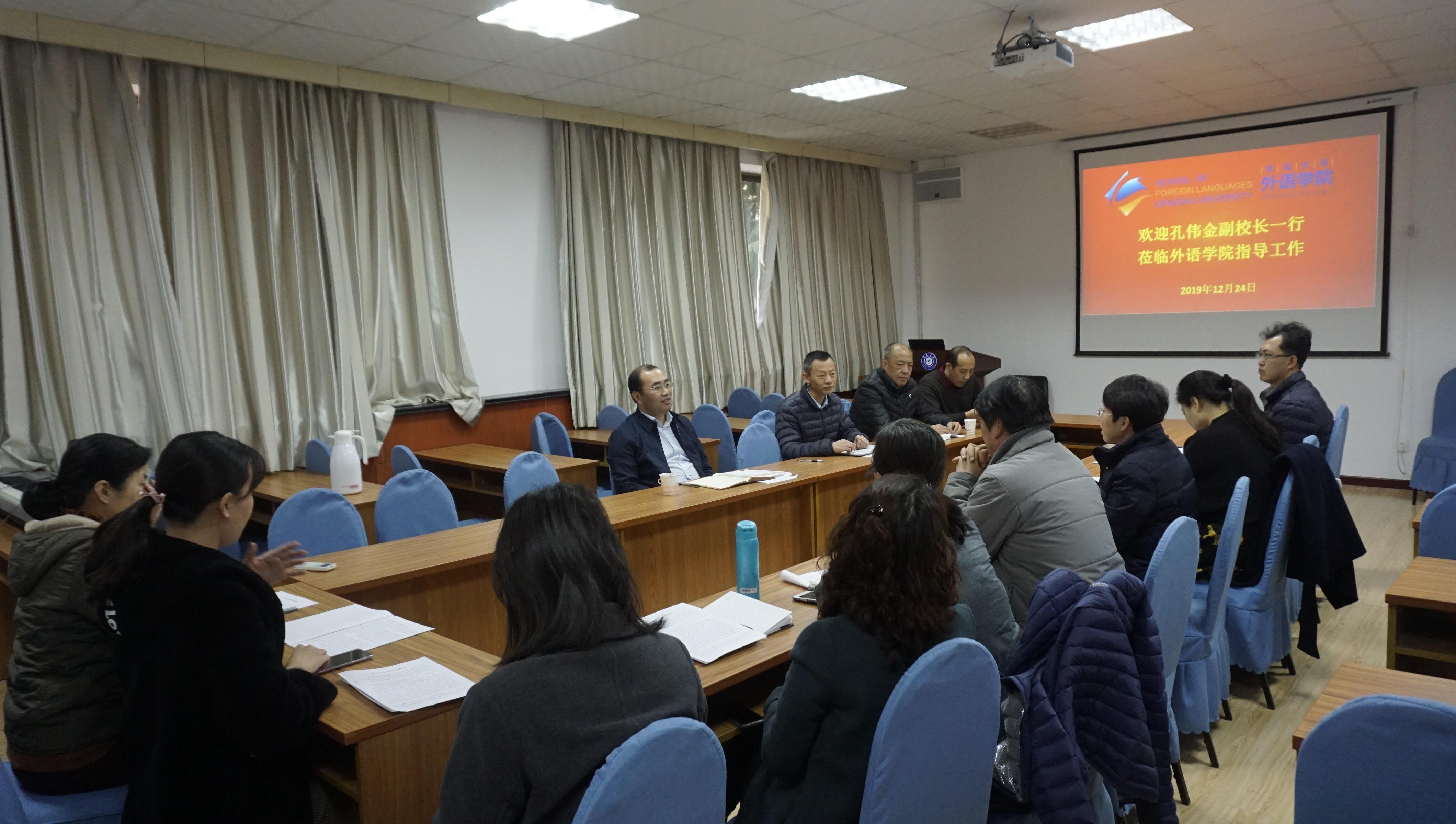 首先,澳门十大电子正规游戏网站院长卞建华代表外院感谢孔校长来学院调研指导并汇报了近期学院工作情况,接着副院长娄永强汇报了学院近期组织部分班子成员和系主任外出调研外语专业大类招生的情况,并结合学院各专业具体情况提出学院明年本科招生的设想。各位系主任也结合各专业特点各抒己见。