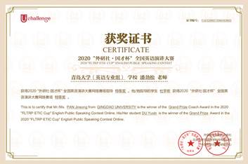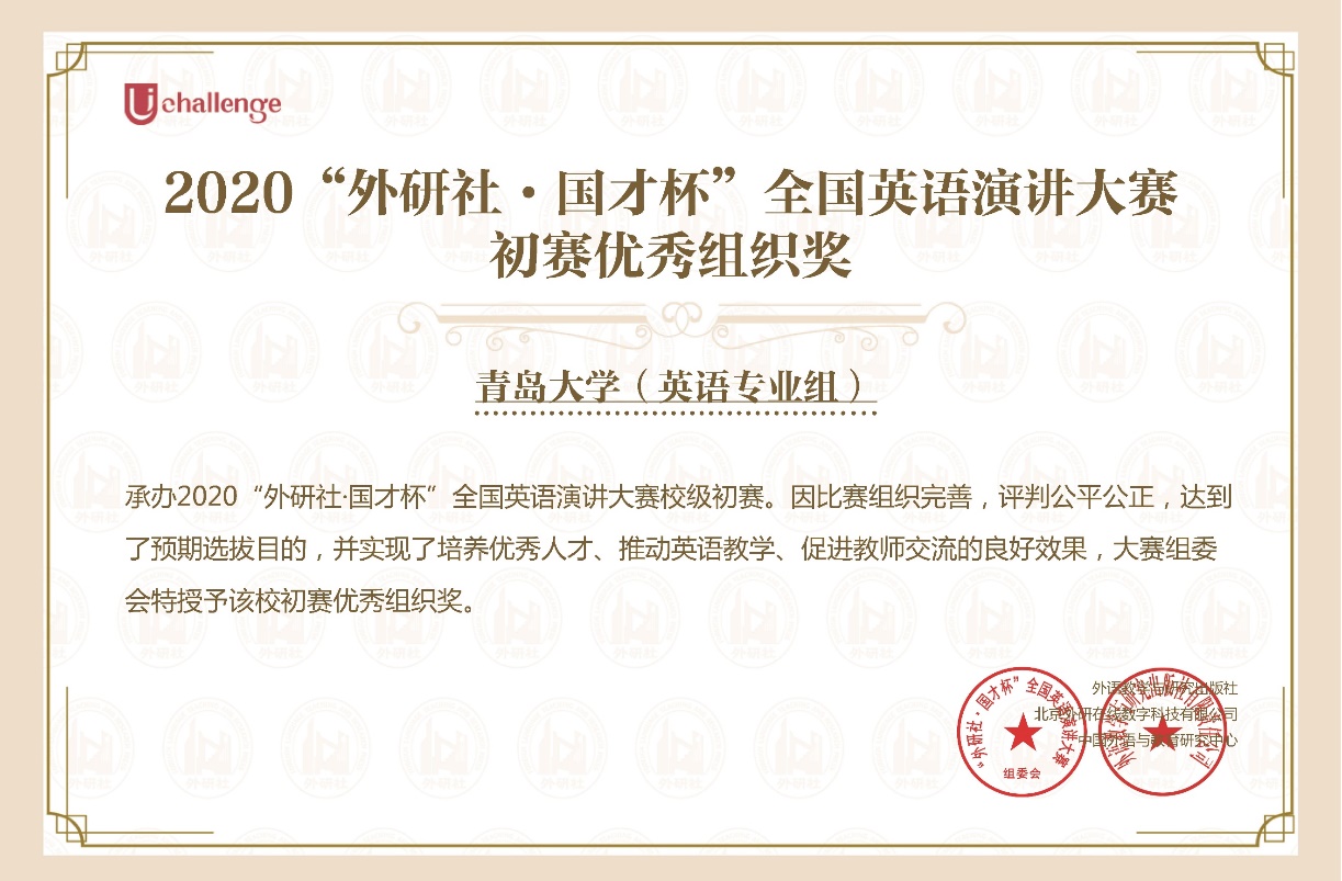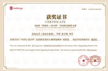 近日,在2020年“外研社·国才杯”全国英语演讲大赛(A类学科竞赛)全国总决赛中,澳门十大电子正规游戏网站2018级英语大数据班杜宇昕同学,经过激烈角逐,最终获得全国总决赛三等奖和网络赛场特等奖的好成绩,实现了英语系在此赛事上的历史性突破,潘劲松老师获得优秀指导教师和初赛优秀管理员奖,澳门十大电子正规游戏网站获得初赛优秀组织奖。