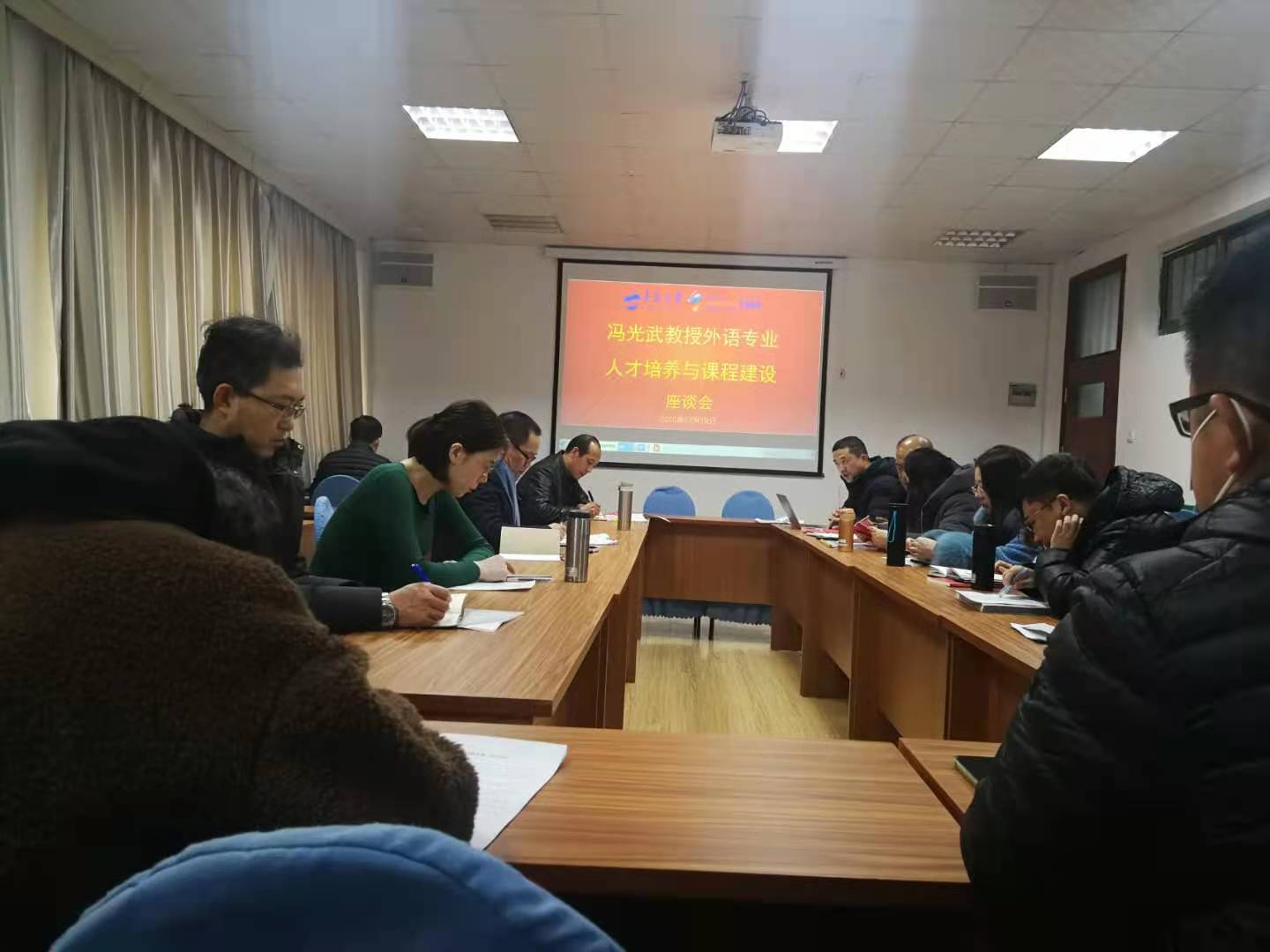 2020年12月18日下午,澳门十大电子正规游戏网站在博文楼312会议室召开学院专业人才培养与课程建设座谈会,邀请教育部高等学校外国语言文学类专业教学指导委员会英语专业教学指导分委员会委员、广东外语外贸大学冯光武教授为十大电子正规游戏官网人才培养,特别是人才培养方案修订、课程建设工作及工作中的问题、疑难和挑战进行指导点评、解答并提出改进意见。座谈会由王传永书记主持,卞建华院长、各系主任、教研室主任及教师代表参加了座谈会。