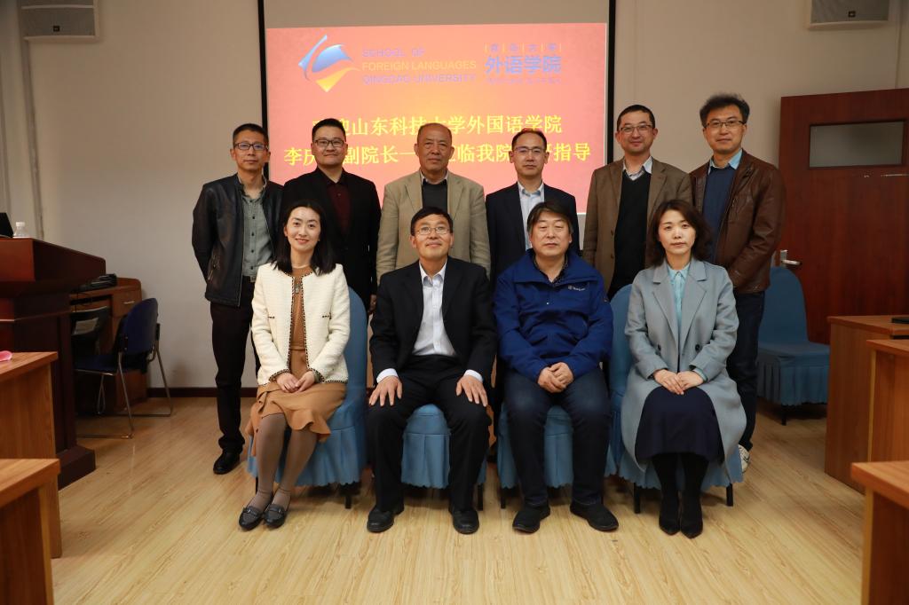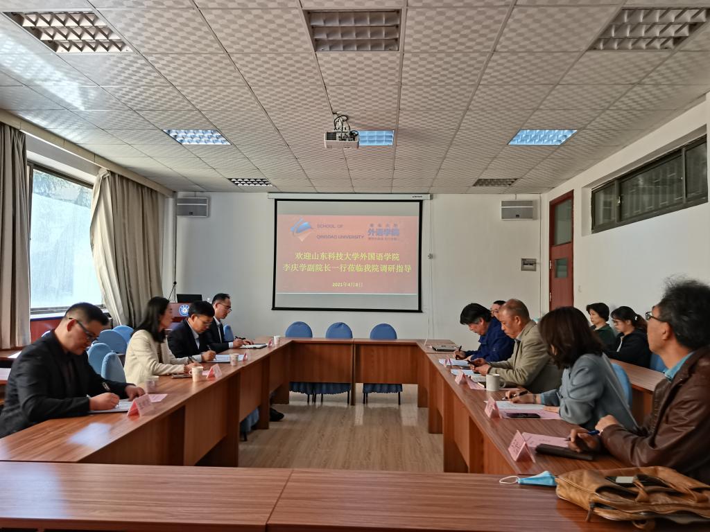 2021年4月8日下午,山东科技大学外国语学院副院长李庆学、英语系主任王明亮、日语系主任陈昌柏和朝鲜语系主任刘霞一行莅临十大电子正规游戏官网进行调研交流。副院长娄永强、英语系主任邢富坤、日语系主任杨剑、朝鲜语系主任崔花、英语教育系主任王进福在博文楼312会议室与客人们进行了深入的交流。