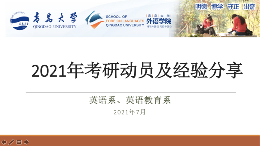 2021年7月15日下午,英语系、英语教育系在博文楼217教室联合举办考研经验交流会。本次交流会采取线上、线下结合的方式进行,五位成功考取硕士研究生的17级同学向英语系、英语教育系的近二百名学弟学妹们分享成功经验。澳门十大电子正规游戏网站娄永强副院长、英语系邢富坤主任、吕云老师、王薇老师和英语教育系王进福老师为同学们简介了英语专业各方向的招生特点并做考研动员。