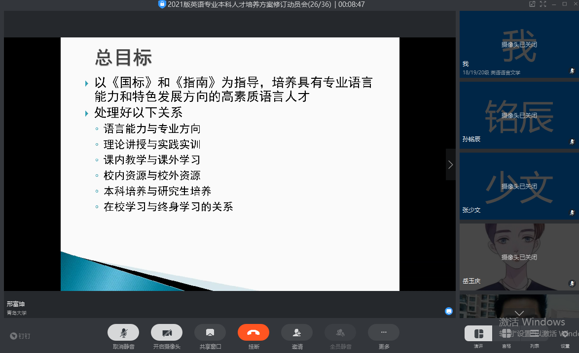 卞建华院长做了总结发言,充分肯定了英语系本科专业人才培养方案修订工作的筹划与部署,并鼓励全系教师以建设好国家一流本科专业建设点为目标,齐心协力,做好全系各项工作。