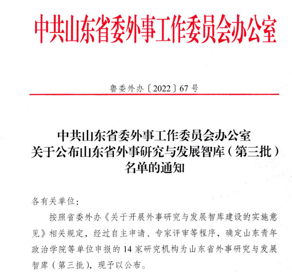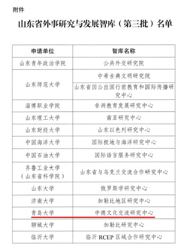 座谈会上,公布了山东省外事研究与发展智库(第三批)名单,确定14家研究机构为山东省外事研究与发展智库,我校澳门十大电子正规游戏网站申报的“中德文化交流研究中心”成功入选,实现澳门十大电子正规游戏网站省级智库平台建设的突破。