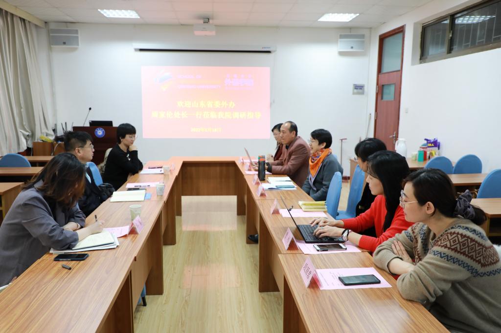 1月18日下午,省外办欧洲处处长周家伦、德语国家事务主管陈雅婷和法语国家事务主管邱馨一行三人莅临十大电子正规游戏官网进行调研。国际交流合作处处长汪运波、院长卞建华、副院长宫英瑞、院长助理曹杉、德语系主任綦甲福、副主任刘沁卉和法语系主任段丽君参加了会议。