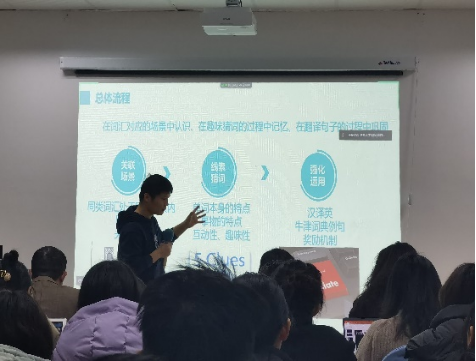 第二组项目名称是《图记—场景词汇辅助记忆软件》,该项目在分析现有背单词软件的不足后,从实际需求出发,设计了场景词汇辅助记忆的程序。以“猜词”的互动形式激发用户的英语学习兴趣,帮助初级学习者在词汇对应的场景中认识单词、在趣味猜词的过程中记忆单词、在翻译句子的过程中巩固学习。