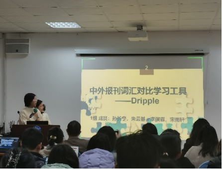 第一组项目名称是《Dripple—中外报刊词汇对比学习工具》,该项目的目标是为解决英语学习的文化背景差异提供支持,项目从中外报刊入手,通过对词汇进行提取与统计,找到高频词组,实现分级效果,还对中外常用表达进行对比,旨在解决英文不同表达的选择倾向问题。