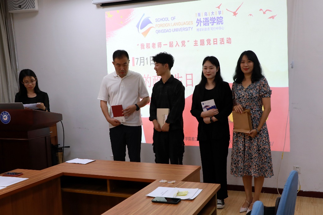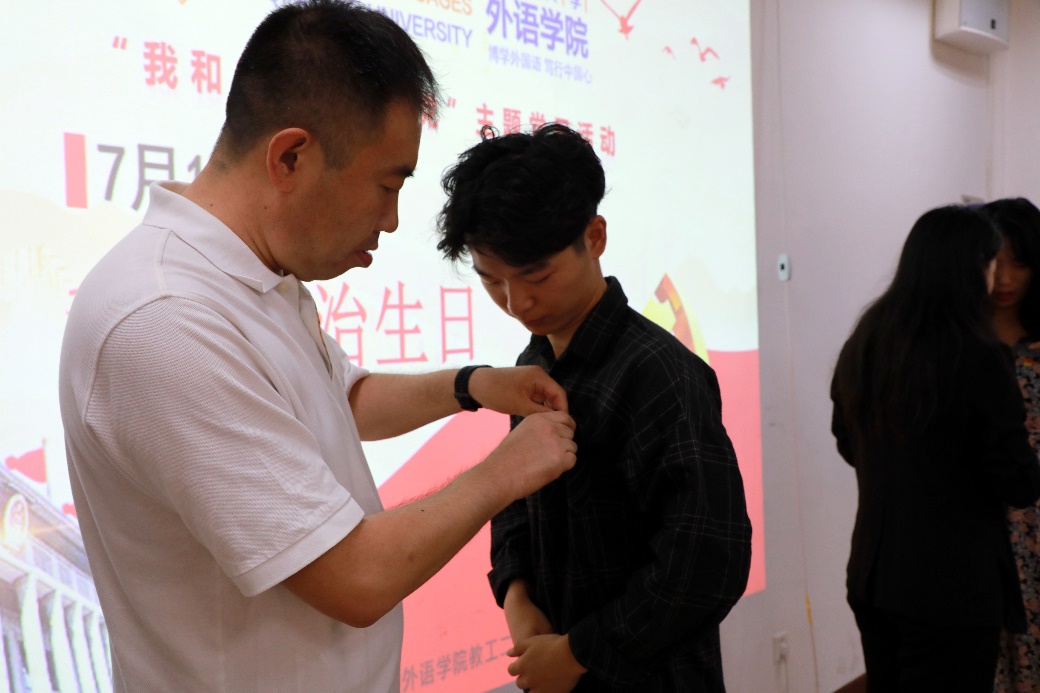 之后主题党日活动开始,通过新发展师生党员结对、互赠纪念礼物、互相佩戴党徽等仪式,大家感受到了组织的温暖和热情。新发展师生党员各抒胸臆,王晓涵同学描述了今天自己内心的激动和澎湃,杨昊老师讲述了家人对他入党行动的影响,马一凡老师讲述了法语系援非教师王墨的事迹对她的震撼和感动。现场新老党员热泪盈眶,不断响起祝福的掌声。最后,学院党委副书记王海青老师对所有新发展师生党员表示热烈祝贺,并送出深切嘱托,希望大家前行路上踔厉奋发,笃行不怠。