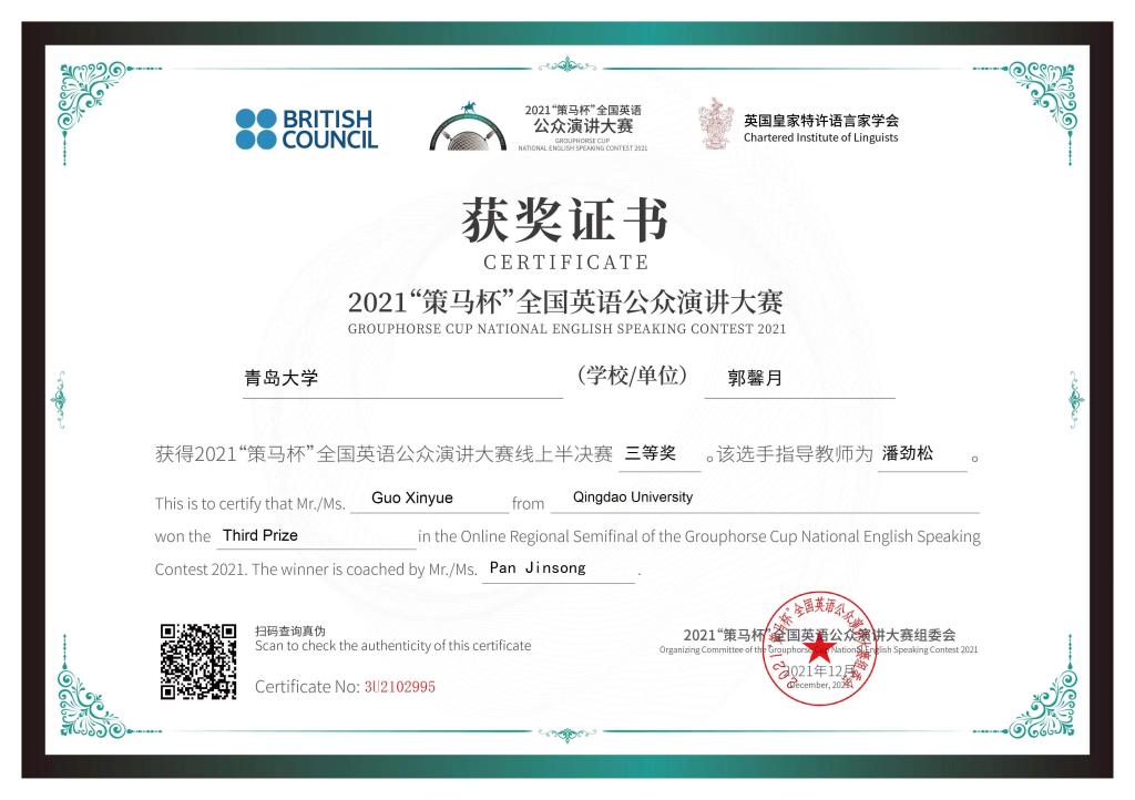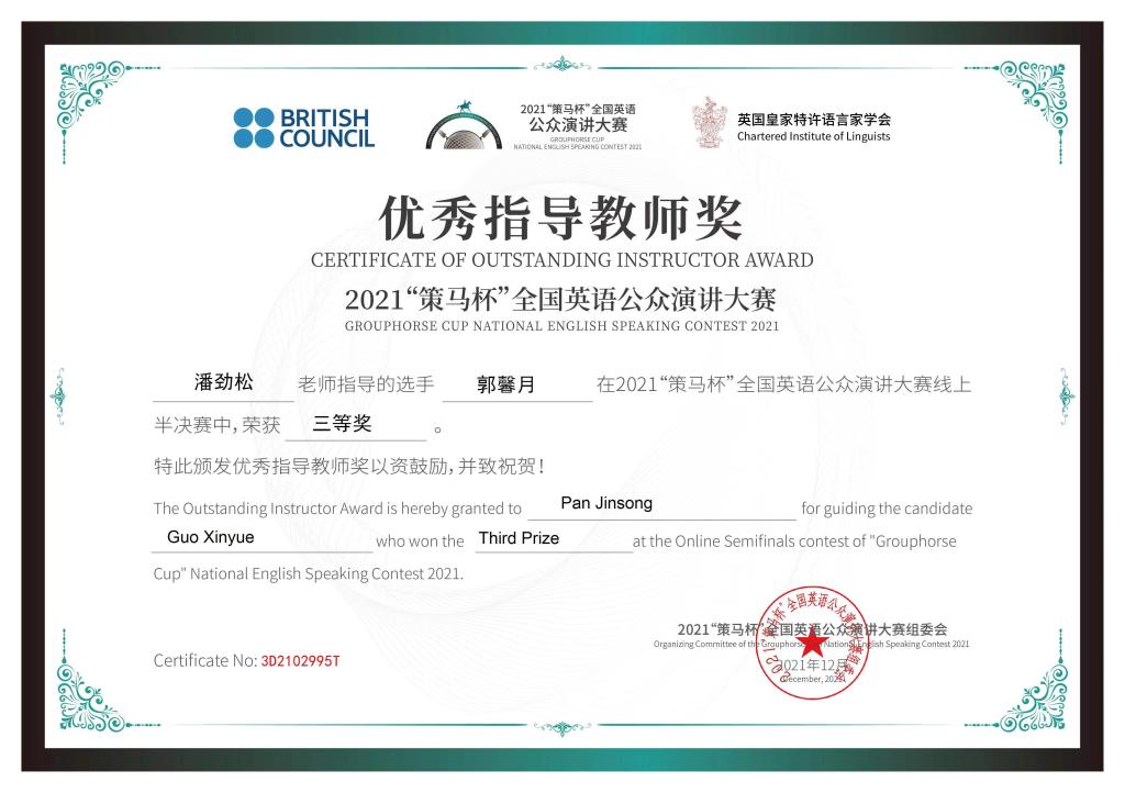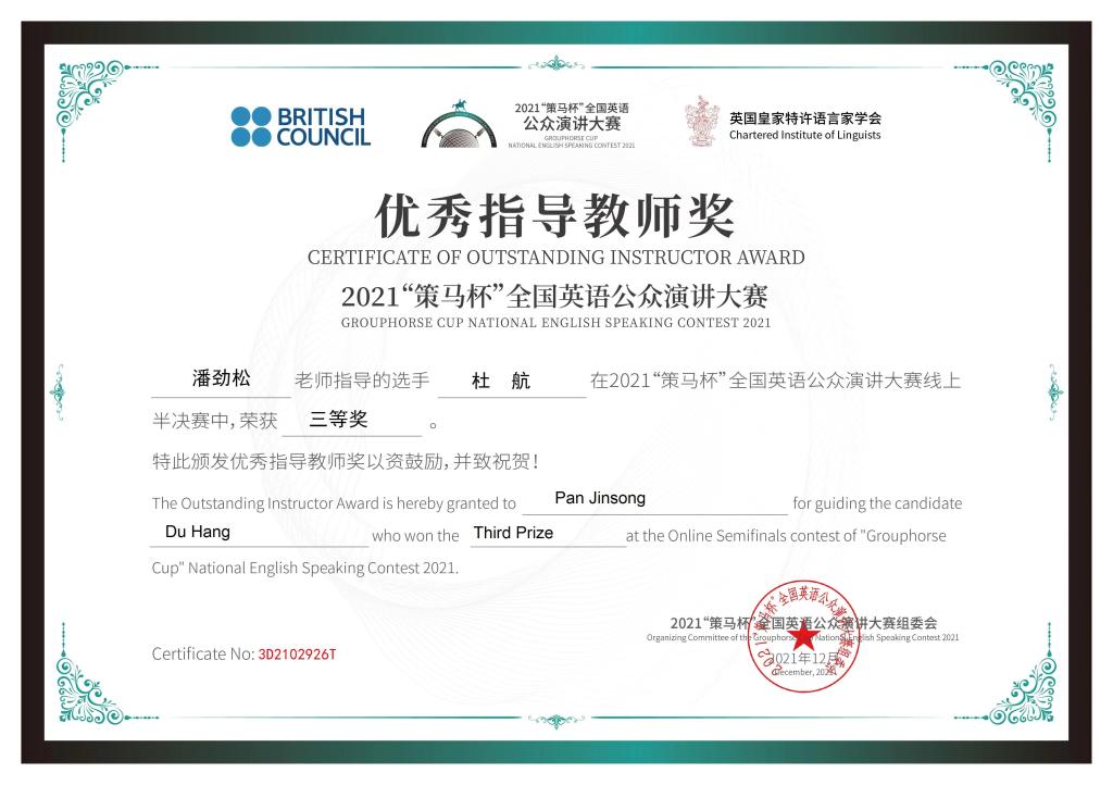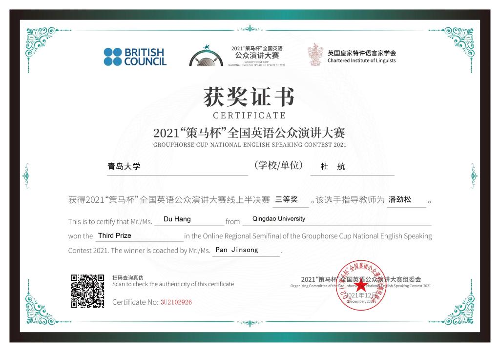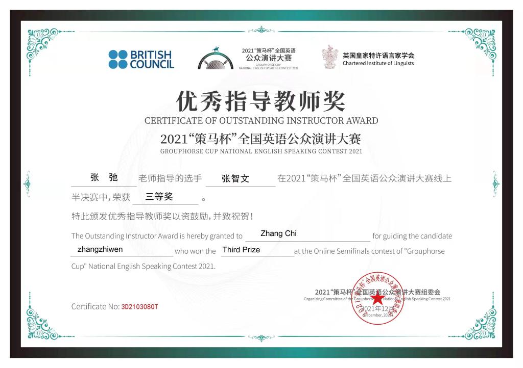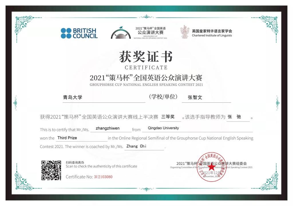 2021“策马杯”全国英语公众演讲大赛半决赛日前结束,十大电子正规游戏官网英语系张智文、杜航和郭馨月三名同学分别通过线上和线下两个赛道,经过初赛、复赛、大区赛、大区复赛和半决赛的层层闯关,从全国几千名选手中脱颖而出,获得三等奖(全国排名前25)的优异成绩。英语系的潘劲松和张驰两位老师获得优秀指导教师奖。