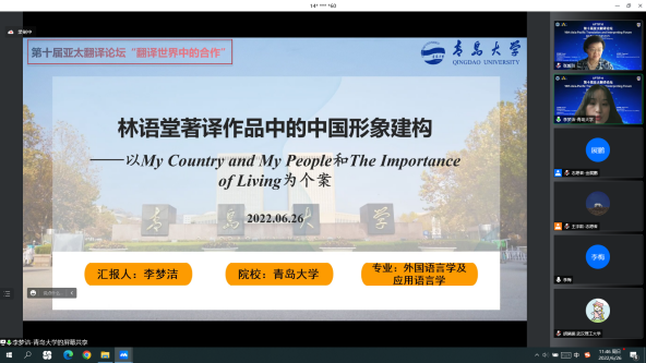 李梦洁同学在“技术辅助的翻译研究”学术新芽研究生分论坛宣读论文“林语堂著译作品中的中国形象建构——以My Country and My People和The Importance of Living为个案”,主要介绍了林语堂著译作品中的中国形象建构以及林语堂在形象建构过程中采取的中国文化译介策略。汇报结束后,专家老师针对相关内容进行了详细的点评,并给出了建议。