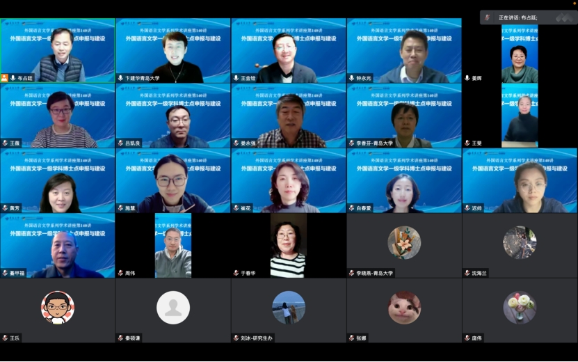 12月14日晚上,澳门十大电子正规游戏网站通过腾讯会议举行了外国语言文学一级学科博士点申报与建设讲座。学院班子、学科负责人、学科骨干等40余人参加了此次讲座,人文社科处钟永光处长、研究生院姜辉副院长应邀出席,卞建华院长主持讲座。
