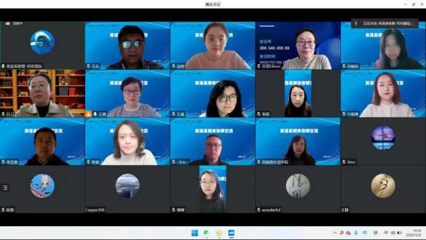 2022年12月8日下午,澳门十大电子正规游戏网站英语系期末教研交流会在线上成功举行。此次教研交流会由英语系副主任王薇主持,英语系全体老师参与了教研交流。