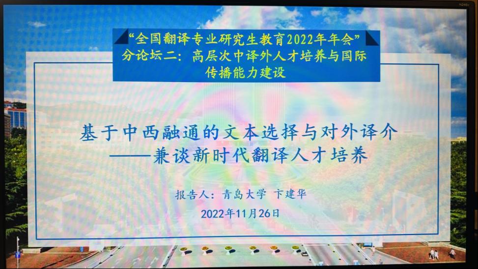 大会设立“翻译专业学位教育规范化标准化建设”、“高层次中译外人才培养与国际传播能力建设”、“翻译专硕多语对建设与区域国别研究和国际组织后备人才培养”、“翻译专硕课程思政建设与师资队伍建设”、“翻译专硕教学创新与翻译技术的应用”和“翻译测试、行业与学业能力标准衔接”等六个分论坛进行研讨。卞建华教授在第二分论坛做了题为“基于中西融通的文本选择和对外译介——兼谈新时代翻译人才培养”的发言,她以林语堂著译作品中的“入西述中”策略为例,探讨了其对中国文化对外译介以及新时代翻译人才培养的启示。