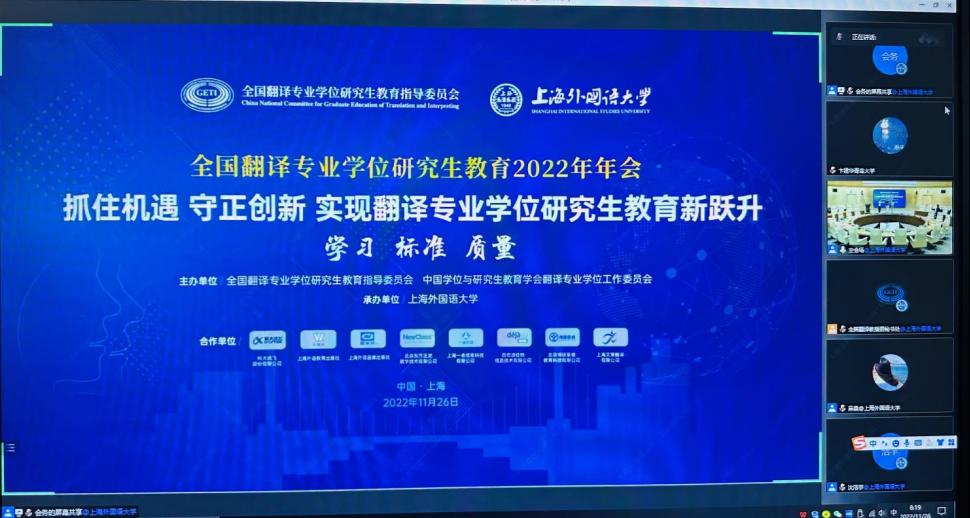 2022年11月26日,全国翻译专业学位研究生教育2022年年会在上海举行。本次年会由全国翻译专业学位研究生教育指导委员会(以下简称“教指委”)和中国学位与研究生教育学会翻译专业学位工作委员会主办,上海外国语大学承办。会议主题为“抓住机遇,守正创新,实现翻译专业学位研究生教育新跃升”,来自中央国家机关、上海市政府相关部门的代表、教指委委员、全国高校及相关单位百余位专家学者,采用线上线下相结合的方式参会,共同探讨了翻译学科和专业学位建设的未来方向。十大电子正规游戏官网院长卞建华教授和德语系綦甲福教授参加会议。