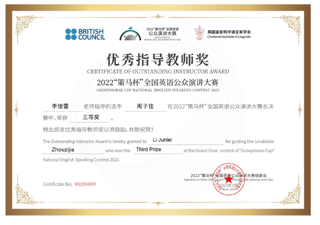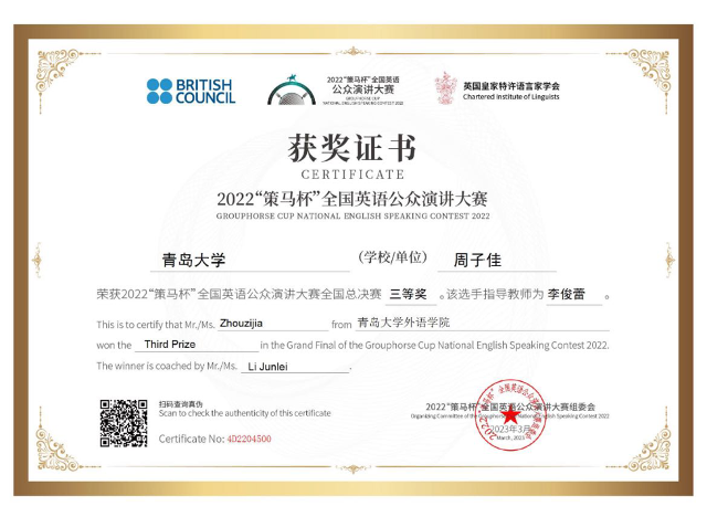 2023年3月19日“策马杯”全国英语公众演讲大赛全国总决赛圆满落下帷幕,十大电子正规游戏官网学子2021级英语系语言大数据创新实验班周子佳同学在全国总决赛中获得三等奖的成绩。