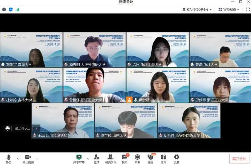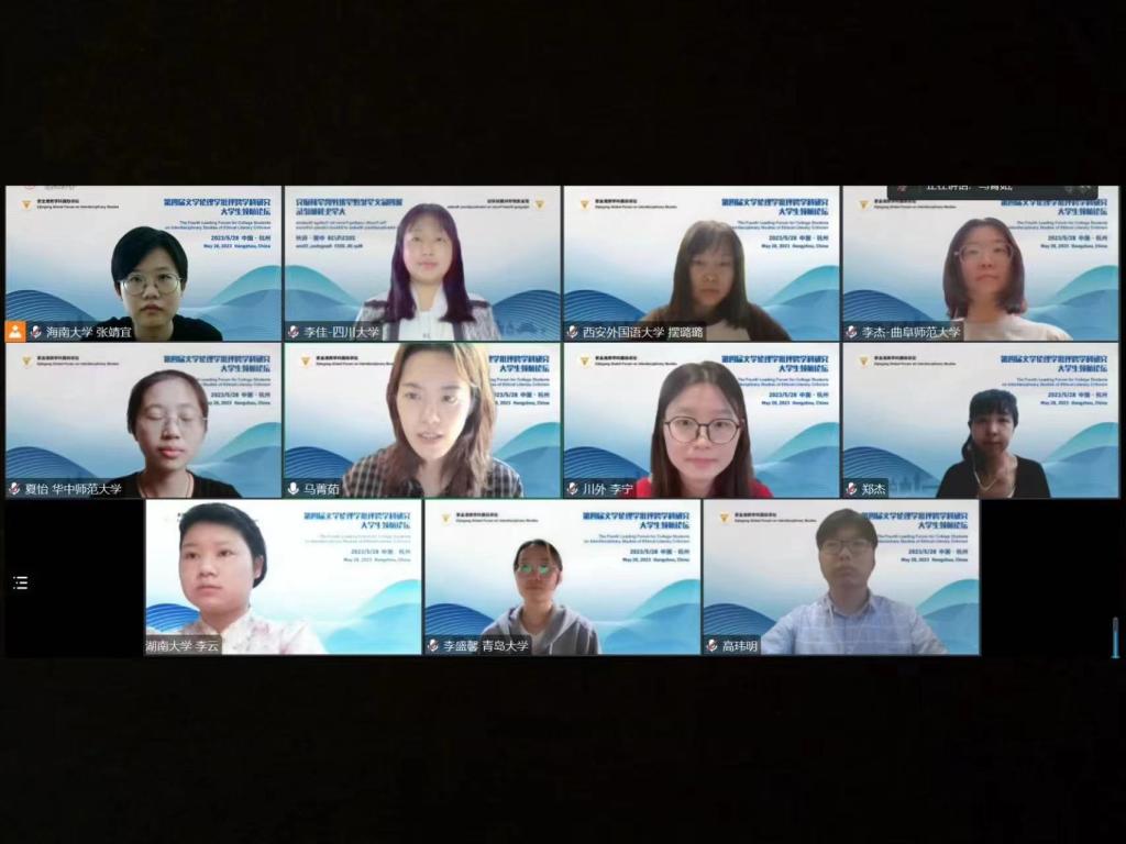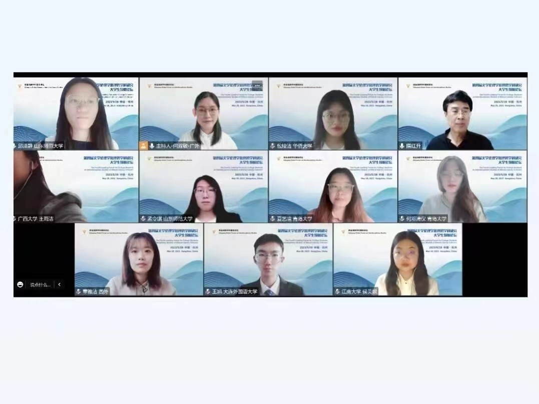 2023年5月28日,澳门十大电子正规游戏网站英语语言文学何邓清仪、李盛馨、刘剑宇、夏艺瑄四位研究生,参加了由浙江大学举办的“第四届文学伦理学批评跨学科研究大学生领航论坛”,并在专题论坛上进行了论文宣读。