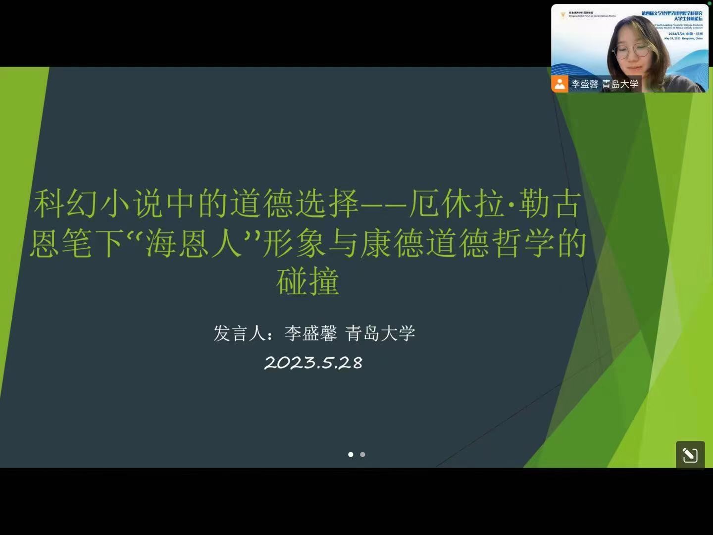 2021级研究生李盛馨同学在专题论坛“科学选择与科幻文学”上作了题为“科幻小说中的道德选择——厄休拉·勒古恩笔下‘海恩人’形象与康德道德哲学的碰撞”的论文汇报,论文分析勒古恩笔下“海恩人”形象与康德道德律及其三尺度的变形内涵之间的对话和联结,汇报得到了评委老师的充分认可,评委老师同时给出了进一步研究的专业建议。