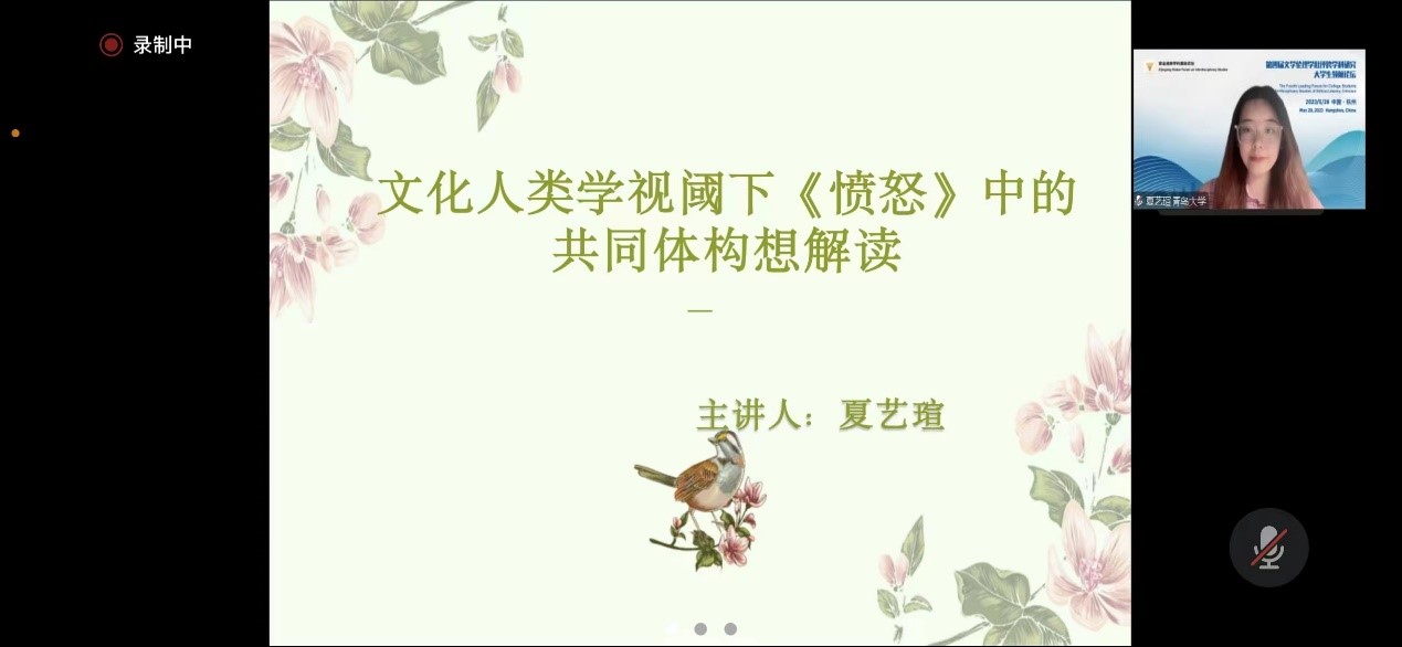 2022级研究生夏艺瑄同学在专题论坛“族裔文学的伦理视角(一)”上作了题为“文化人类学视阈下《愤怒》中的共同体构想解读”的论文汇报,论文从文化人类学视角解读菲利普·罗斯小说《愤怒》中年轻群体在宗教、家庭、爱情等维度下的挣扎与反抗困境,汇报过程中,评委老师对论文给与了充分肯定,并且对更深层次的研究提出宝贵建议。